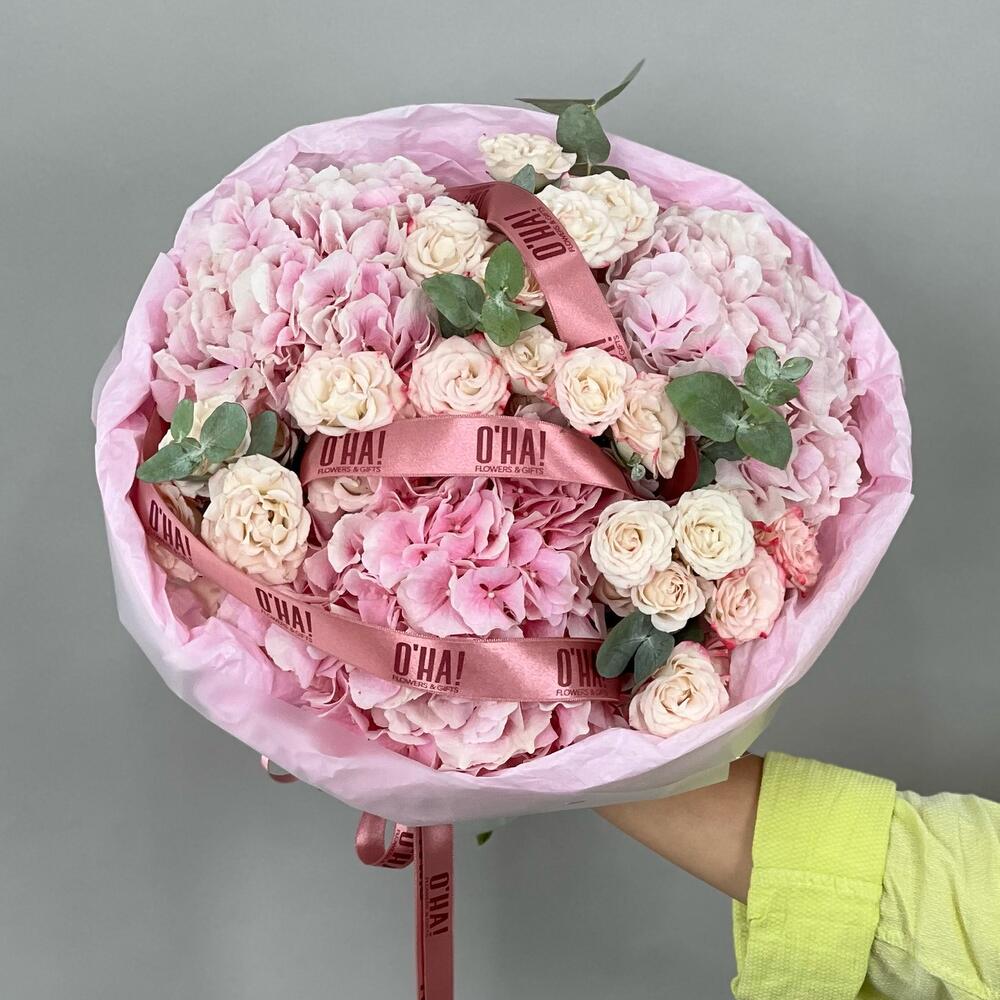 Zarif ve havadar Soft Serenade, kabarık pembe ortancalar, pembe dal gülleri ve taze okaliptusu bir araya getirerek nazik, romantik bir his yaratır. İçten jestler veya herhangi bir vesileye zarafet katmak için mükemmeldir.