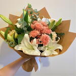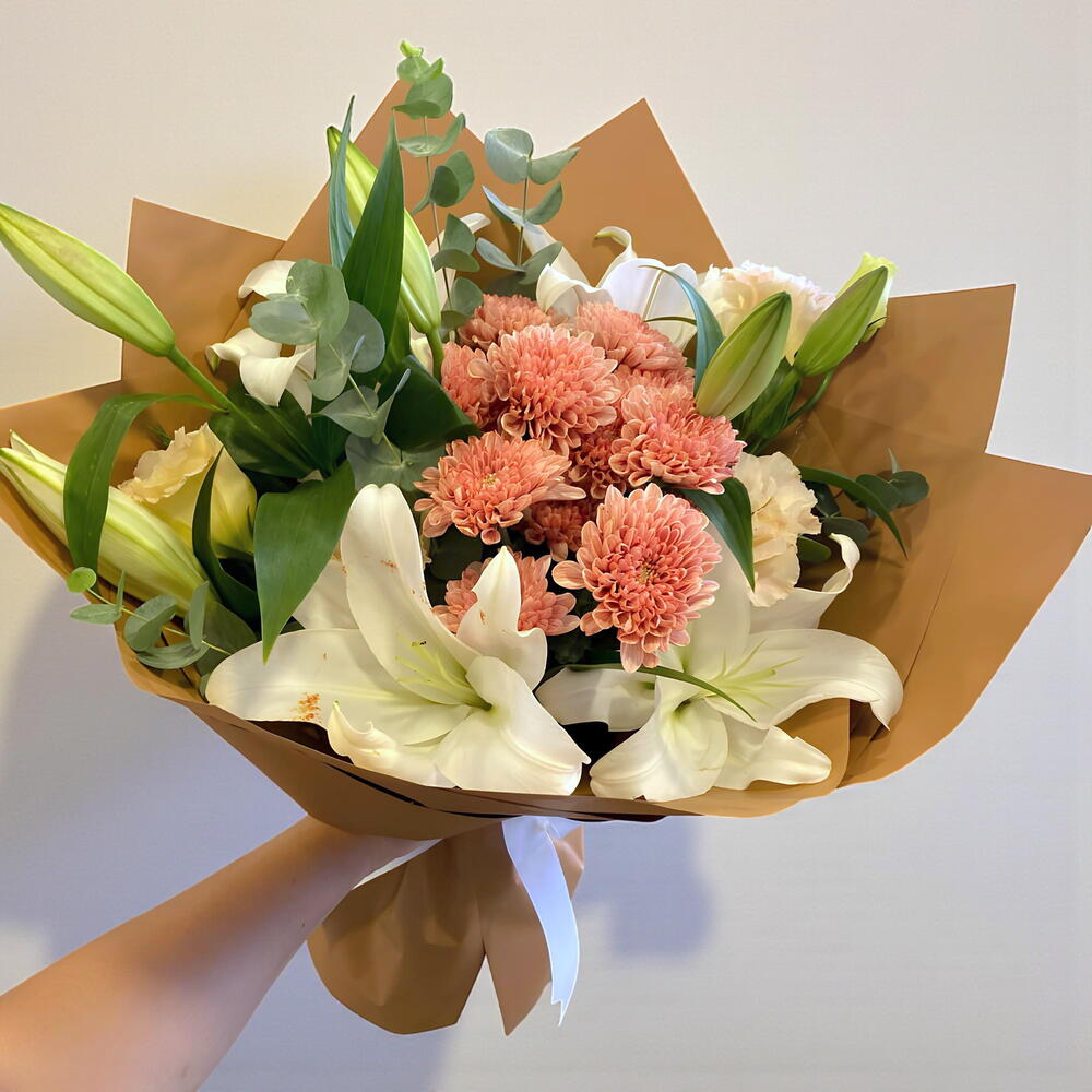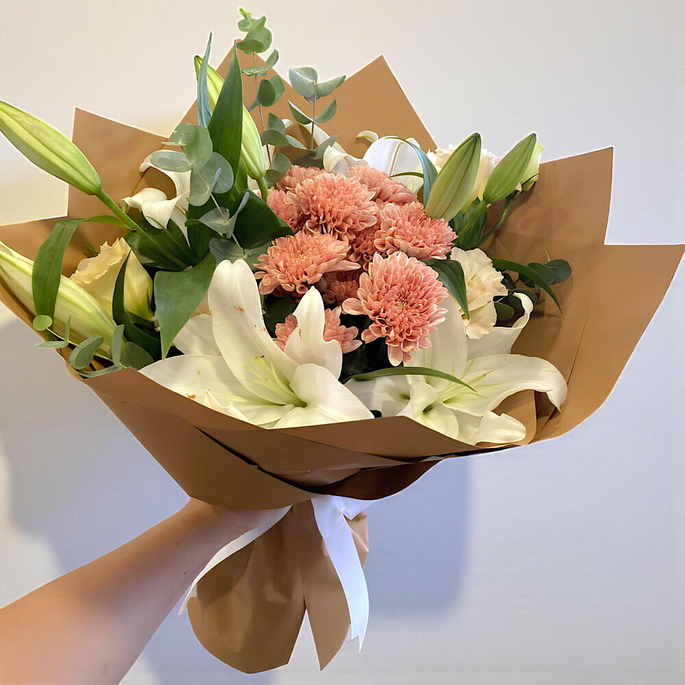okaliptüs - 5 adet beyaz lilyum kandili - 8 adet somon lisyantus - 6 adet gül kurusu krizantem çiçeği - 15 adet