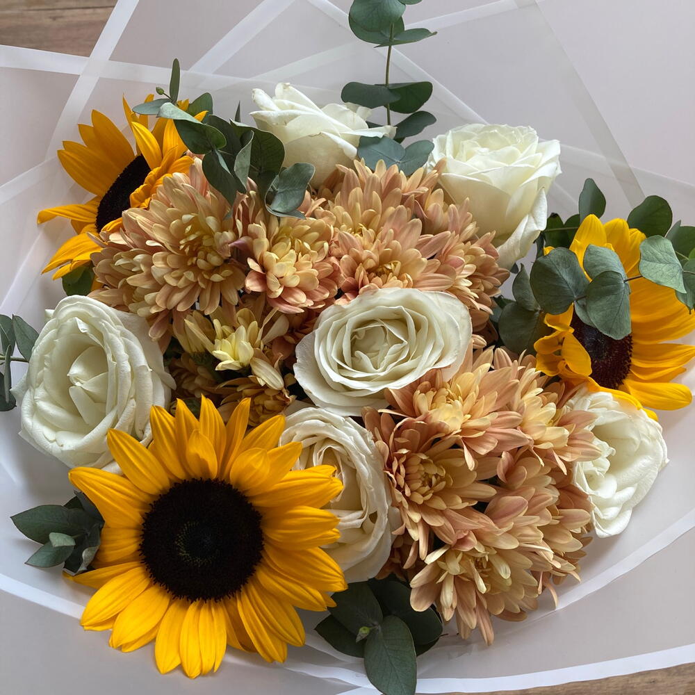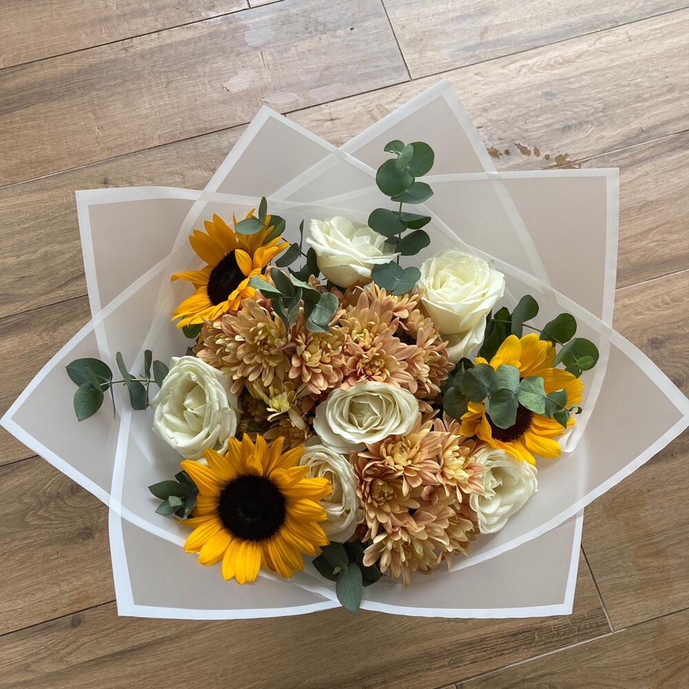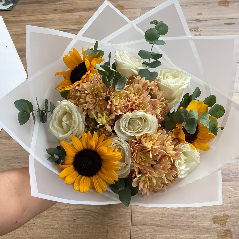 okaliptüs - 8 adet beyaz gül - 6 adet ayçiçeği - 3 adet beyaz buket kağıdı - 3 adet somon krizantem - 21 adet