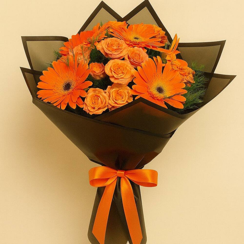virgatus - 10 adet turuncu çardak gül - 5 adet siyah ambalaj kağıdı - 3 adet turuncu gerbera - 5 adet turuncu kurdela - 1 adet