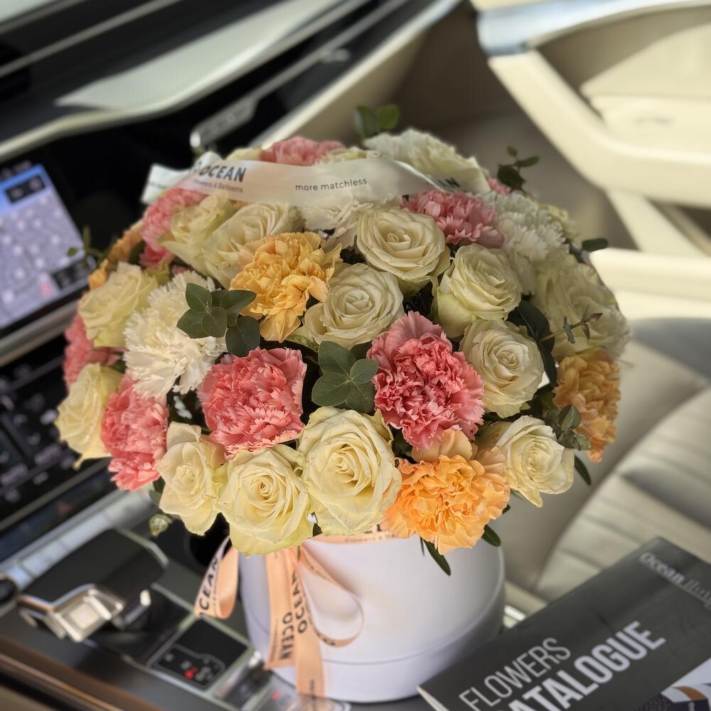 Bu muhteşem kutu çiçek aranjmanı, 20 adet beyaz gül, 30 adet karanfil ve 15 adet okaliptüs ile özenle hazırlanmıştır. Zarif ve sofistike görünümü ile sevdiklerinizi etkilemek için mükemmel bir seçim. İster özel bir gün için bir hediye, ister sadece sevdiklerinizi mutlu etmek için, bu kutudaki çiçekler mükemmel bir dokunuş olacaktır. Kendi kendine bir sanat eseri olan bu çiçek tasarımı, herhangi bir ortama doğal bir güzellik ve tazelik katar. El yapımı ve taze çiçeklerle hazırlandığı için, sevdikleriniz uzun süre bu güzelliğin keyfini çıkarabilecek.
