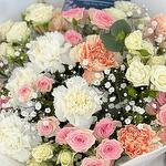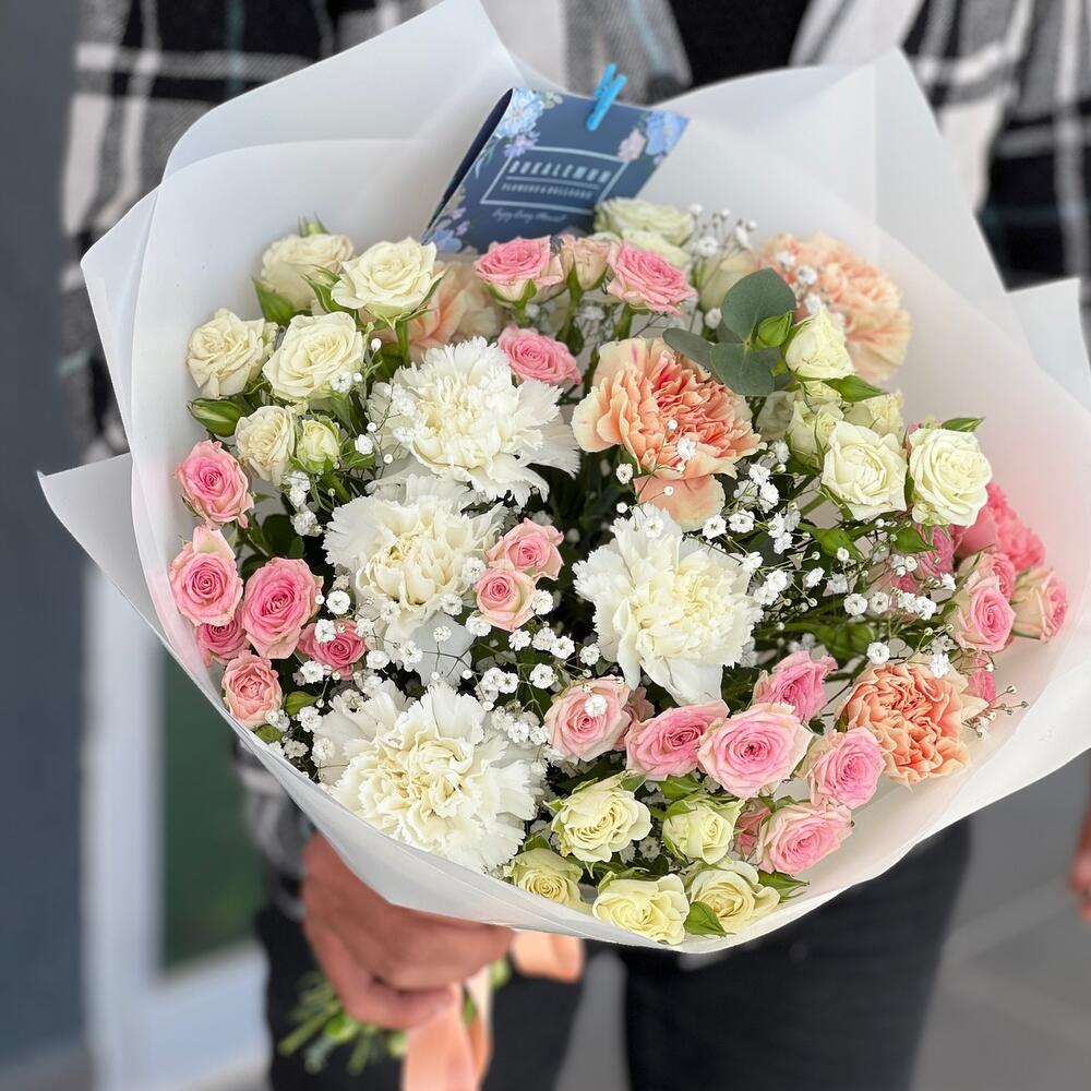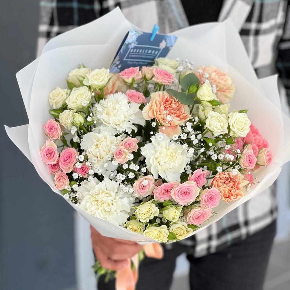 Mix buket içerisinde spray güller ve soft renklerde dianthuslar bulunan