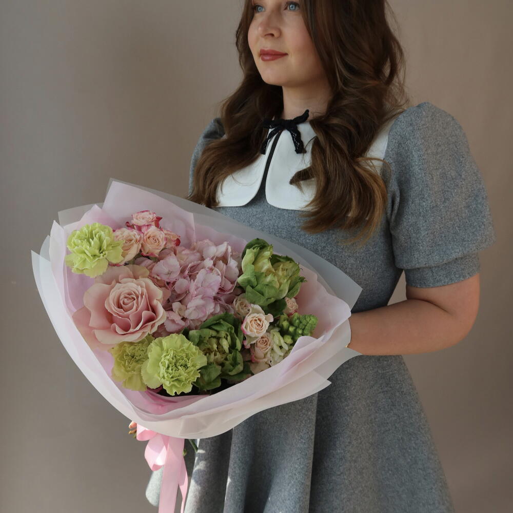 Pembe ve yeşil tonlarında yumuşak ve zarif bir buket, narin ortancalar ve klasik güller içerir. Nazikliği, sevgiyi ve seçkin zevki ifade etmek için mükemmel💕