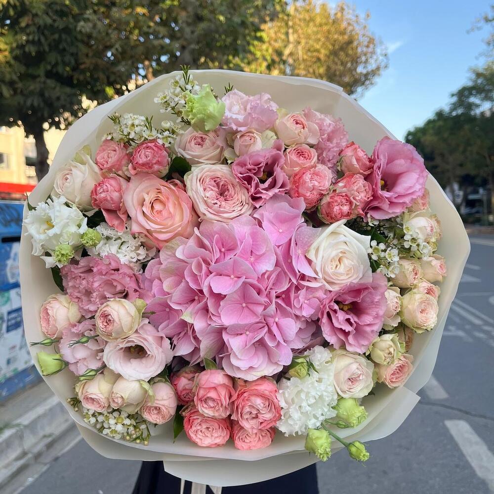 Spray rose - 5 adet rose - 5 adet waks çiçek - 3 adet hidrangea - 1 adet lisyantus - 5 adet