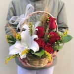 Ürün Özellikleri: Beyaz Lilyum Çiçekleri: Aranjman, beyaz lilyum çiçekleri ile göz alıcı bir görünüm sunar. Her bir lilyum, saf güzelliği ve zarafeti temsil eder. Kırmızı Gül Düzenlemesi: Aranjmanda yer alan kırmızı güller, tutkunun ve aşkın simgesidir. Her bir gül, derin duyguları ifade eder. Hasır Sepet Tasarımı: Zarif bir hasır sepet içinde düzenlenen çiçekler, doğal ve şık bir atmosfer yaratır. Dekoratif Bağlama ve Süslemeler: Tasarım, özel bağlama ve dekoratif süslemelerle tamamlanmıştır. Bu detaylar, aranjmanın göz alıcı ve şık olmasını sağlar. Şeffaf Ambalaj: Zarif bir şeffaf ambalaj içinde sunularak, çiçeklerin doğal güzelliği ön plana çıkarılır.