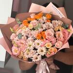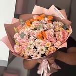 Bu zarif mono buket, 5 adet krizantem, 15 adet eustoma ve 13 adet gül ile özenle hazırlanmıştır. Krizantemlerin saflığı, eustomaların zarafeti ve güllerin romantik kokusu mükemmel bir uyum içerisindedir. Bu buket, sevdiklerinize olan duygularınızı en güzel şekilde ifade etmeniz için idealdir. Kendine özgü tasarımı ve taze çiçeklerden oluşan bu kombinasyon, her türlü özel gün için mükemmel bir seçim olacaktır.