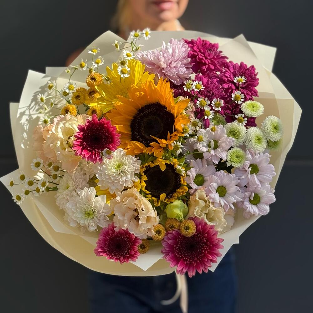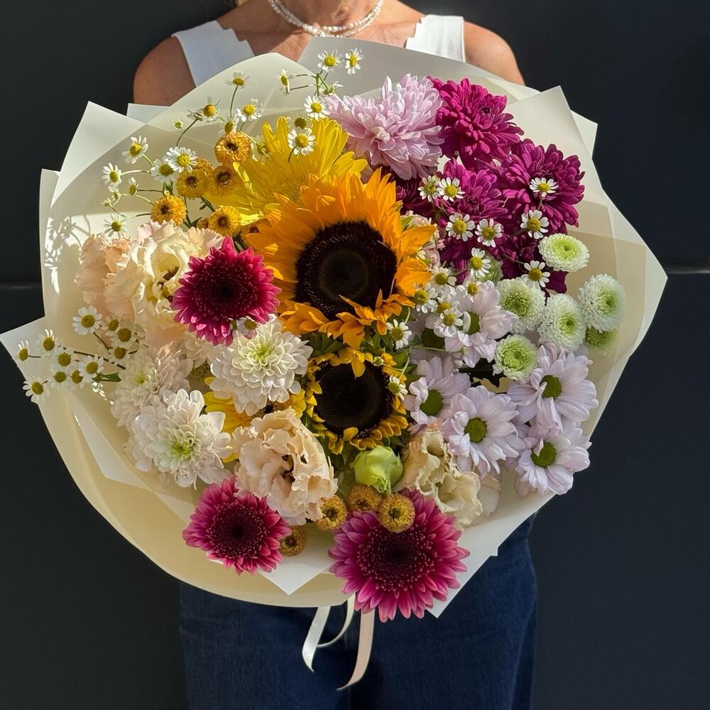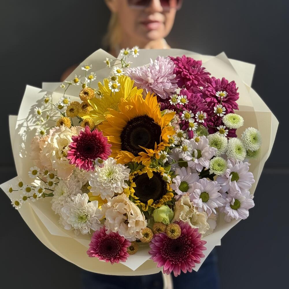 Gerbera - 5 adet krizantem - 5 adet papatya - 1 adet liziantuz - 2 adet ay çiçeği - 2 adet