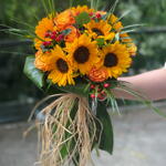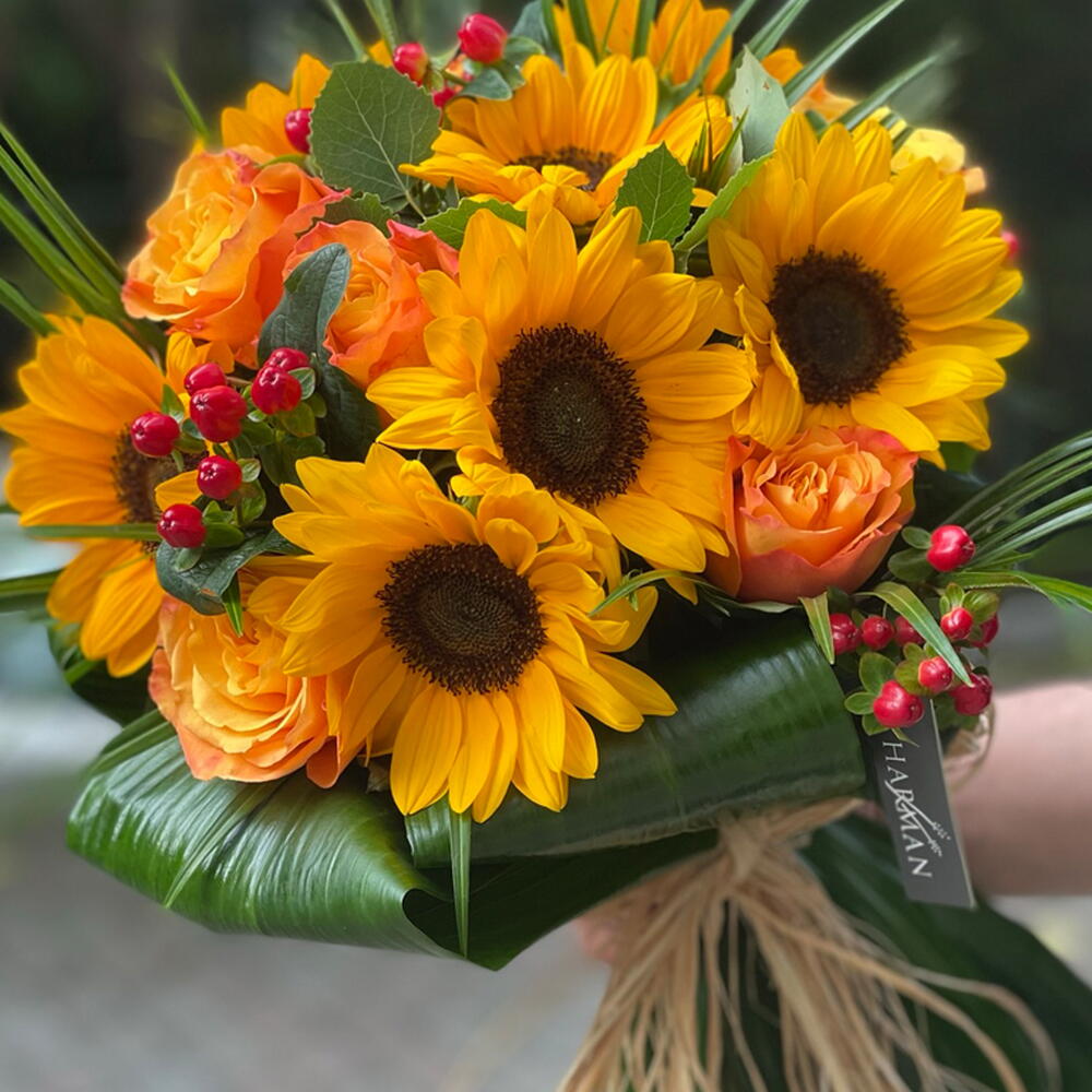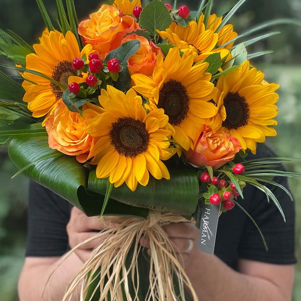 Dekoratif yeşilliklerle tamamlanan ayçiçekleri ve turuncu güller içeren şık bir buket tasarımı. Ürün yüksekliği: 60 cm. 6 ayçiçeği ve 3 turuncu gül ile düzenlenmiştir. Dekoratif yeşilliklerle süslenmiş, ayçiçekleri ve turuncu güller içeren zarif bir buket. Ürün yüksekliği: 60 cm. İçerik: 6 ayçiçeği ve 3 turuncu gül.
