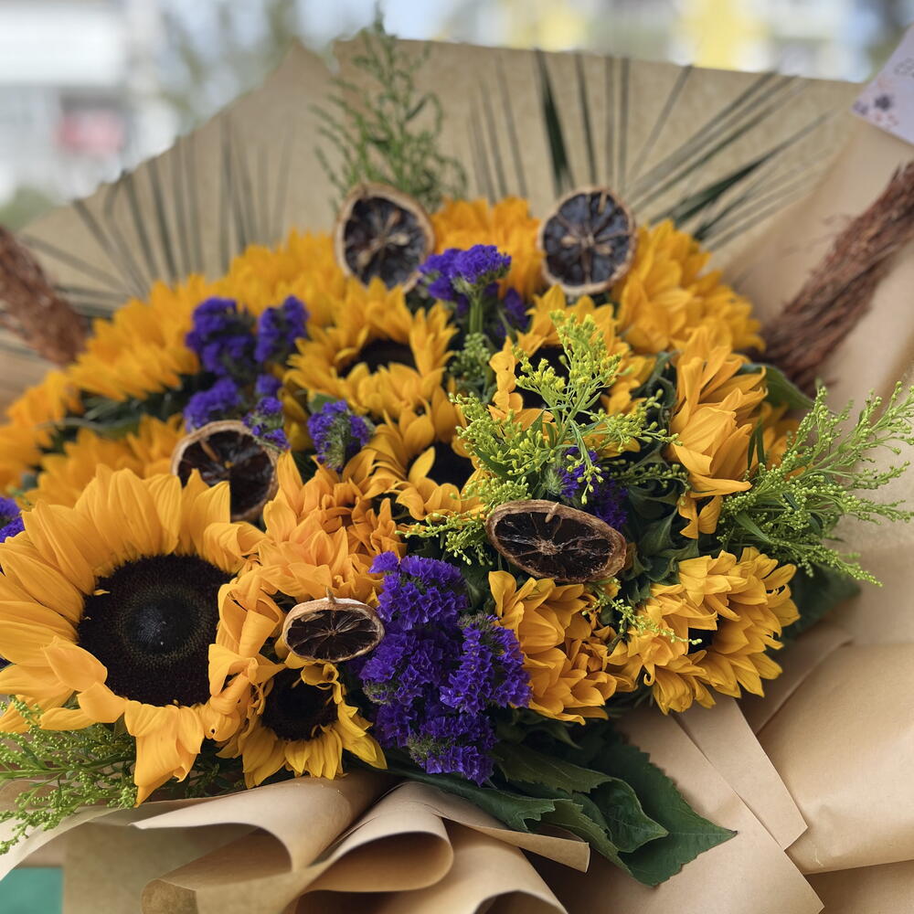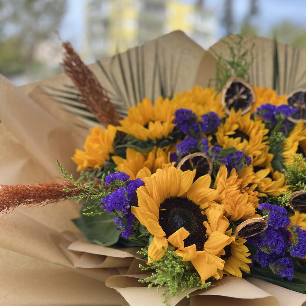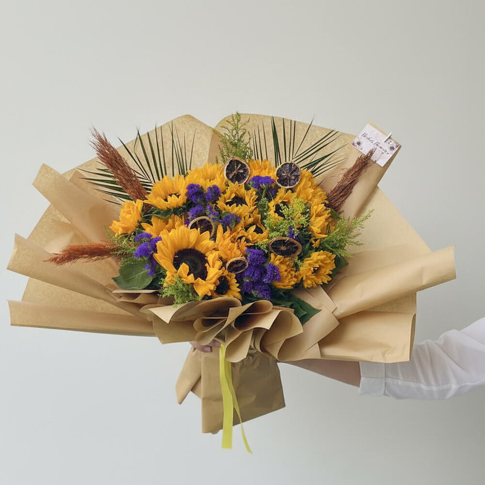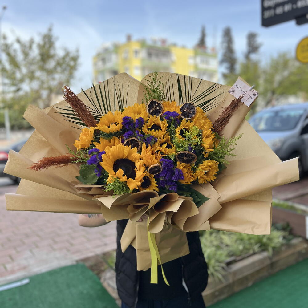 Bu harika çiçek buketi, zarif ve canlı renkleriyle göz kamaştırıyor! Güneşin Enerjisini Yansıtan Ayçiçekleri ile Bir Bütün Oluşturan Mor Detaylar Müthiş Bir Uyum Yakalıyor! Sevdiklerinizin Yüzünde Kocaman Bir Gülümseme Yaratmak İstiyorsanız Hemen Sipariş Oluşturabilirsiniz 🌻