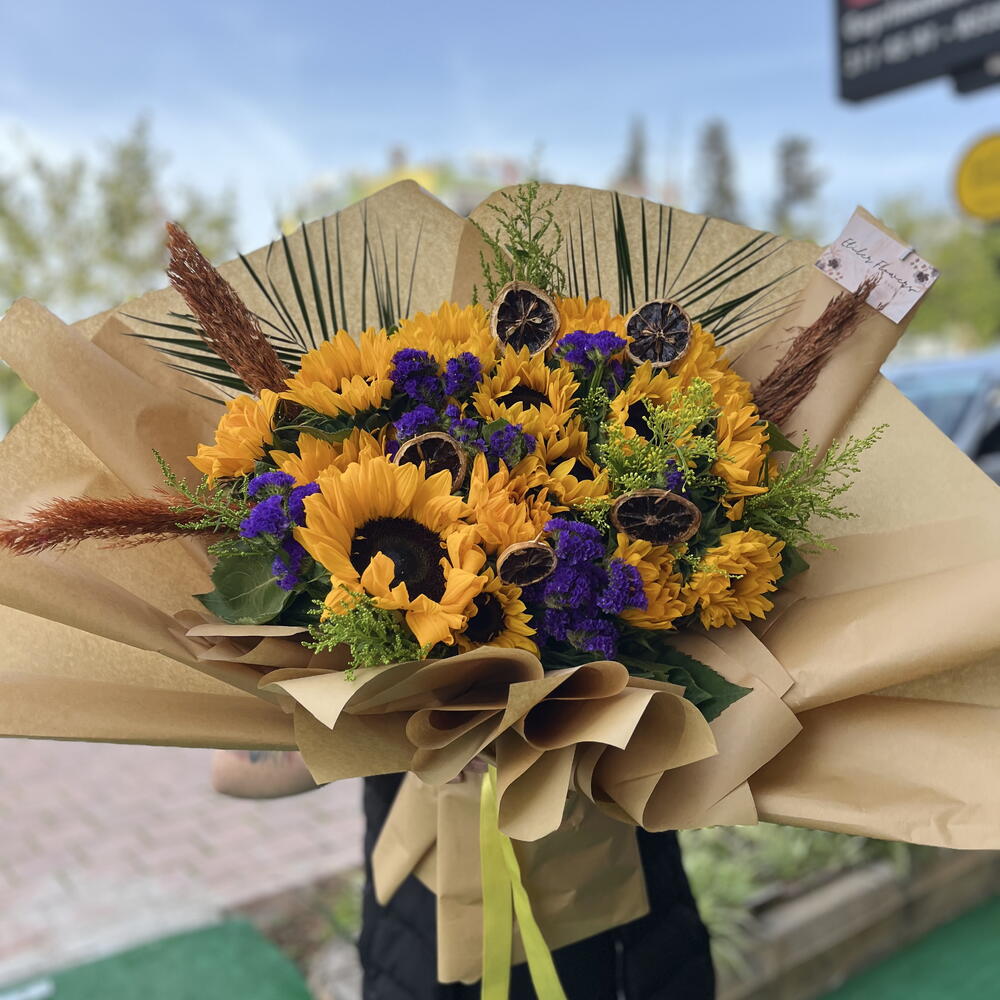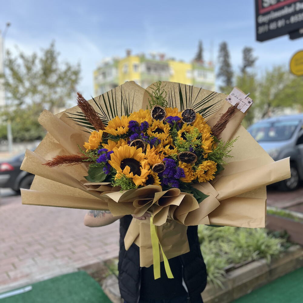 Sunflower - 15 adet lemon - 5 adet pampas - 3 adet solidaster - 7 adet purple flowers - 5 adet fenix yaprak - 2 adet
