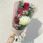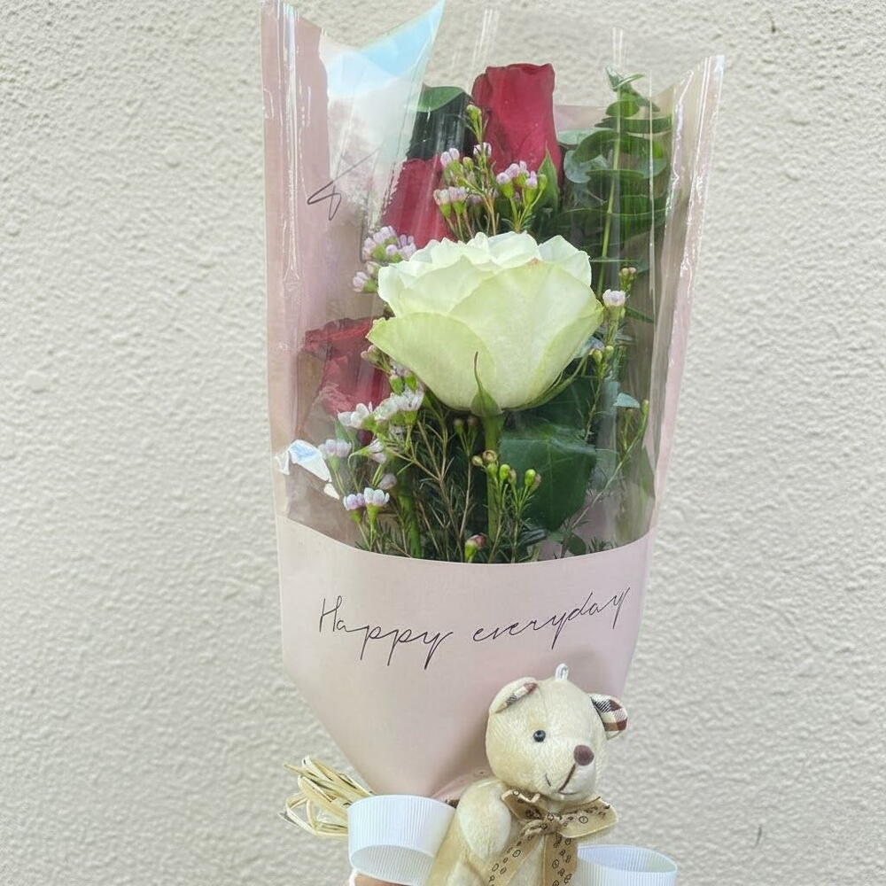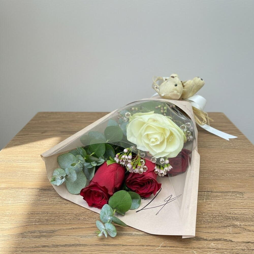 Zarif ve romantik dokunuşlarla hazırlanan bu taze çiçek buketi, özel anları unutulmaz kılmak için harika bir seçenektir. Beyaz ve kırmızı güllerin uyumu, yanında eşlik eden narin çiçekler ve yeşilliklerle tamamlanarak şık bir tasarım oluşturur. Sevimli peluş ayıcık detayı, bukete sıcak ve samimi bir hava katarken, pastel tonlardaki ambalajı ile göz alıcı bir hediye alternatifi sunar. Sevdiklerinize duyduğunuz sevgiyi ve özel hislerinizi en zarif şekilde ifade etmek için ideal bir bukettir. Çiçekleri taze tutmak için saplarını 2 günde bir 1-2 cm kesin ve temiz suya yerleştirin. Direkt güneş ışığından uzak, serin bir ortamda muhafaza edin. Vazonun suyunu her gün değiştirerek çiçeklerin ömrünü uzatabilirsiniz. Solmaya başlayan yaprakları ve çiçekleri nazikçe temizleyin.