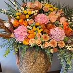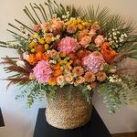 okaliptüs - 5 adet pampas grass - 3 adet hipericum - 15 adet pembe gül - 10 adet ortanca - 3 adet turuncu gül - 10 adet palmiye yaprakları - 2 adet cardak truncu gul - 10 adet