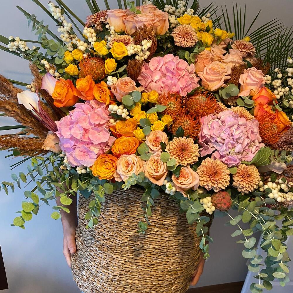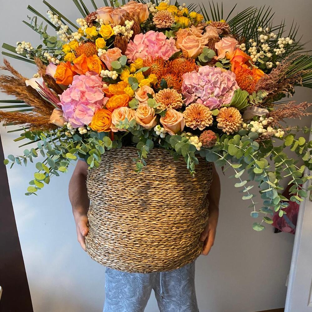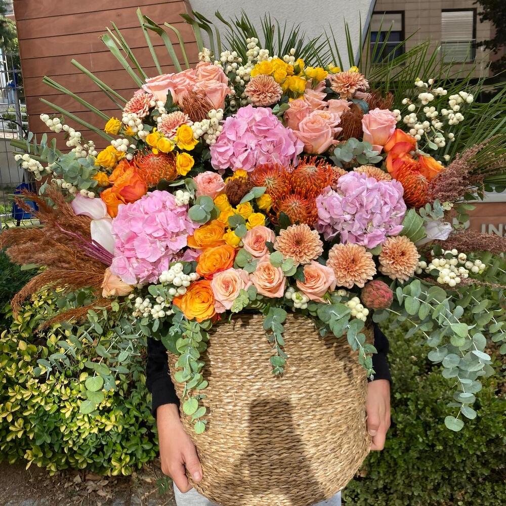 okaliptüs - 5 adet pampas grass - 3 adet hipericum - 15 adet pembe gül - 10 adet ortanca - 3 adet turuncu gül - 10 adet palmiye yaprakları - 2 adet cardak truncu gul - 10 adet