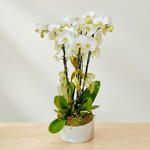 Ev veya ofisinizin ortamını tazelemek ve estetik bir dokunuş sağlamak için mükemmel bir seçenek olan bu ürün, zarif dört dallı beyaz orkideler ve yosmadan oluşmaktadır. Ürün, dört adet rafya kurdele ile süslenmiş ve bir adet silindirik cam saksıya özenle yerleştirilmiştir. Bu huzur verici dekoratif çiçek, iç mekanınıza natural ve zarif bir hava katacaktır.