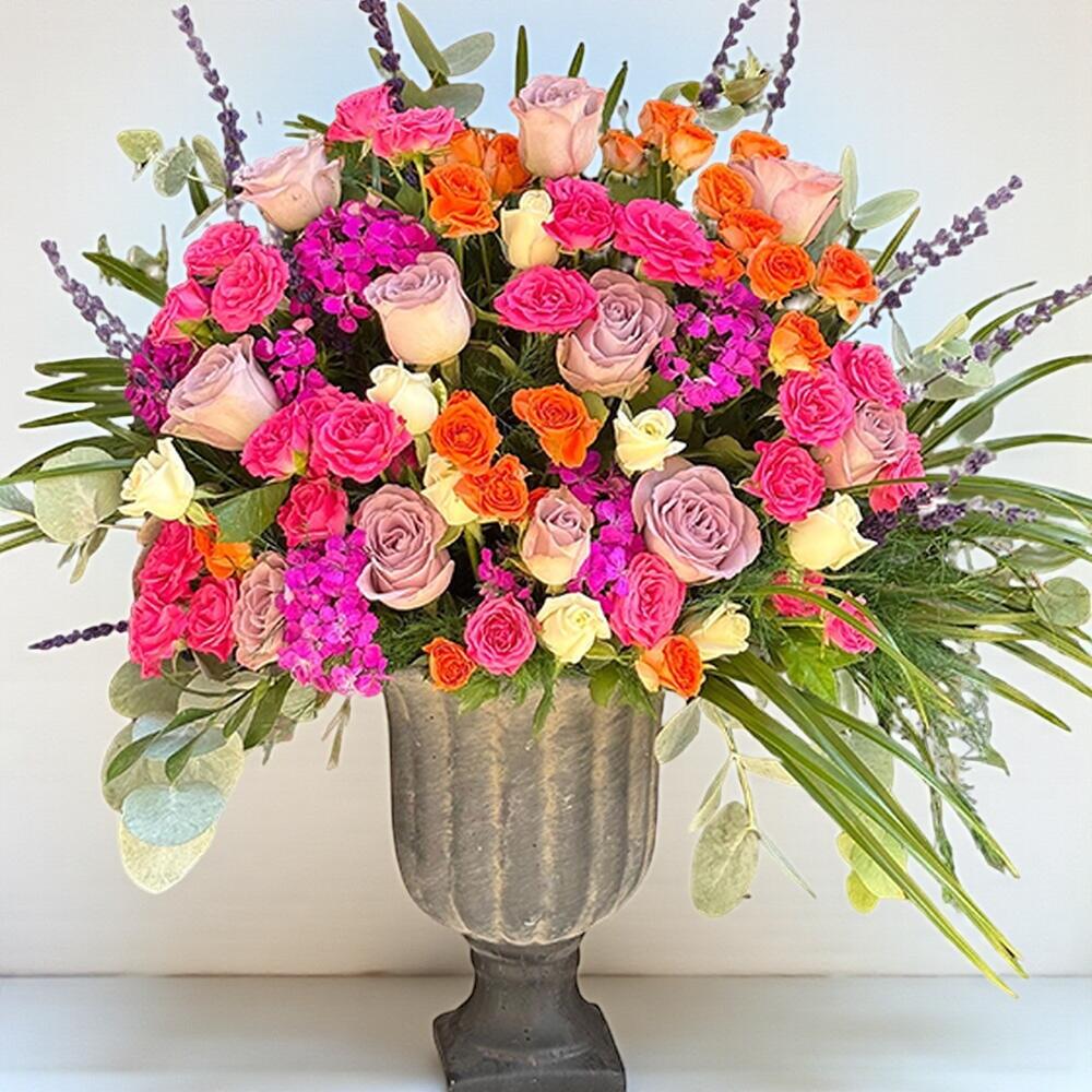 pembe gül - 15 adet beyaz gül - 10 adet lila gül - 10 adet hüsnü yusuf çiçeği - 10 adet turuncu gül - 10 adet