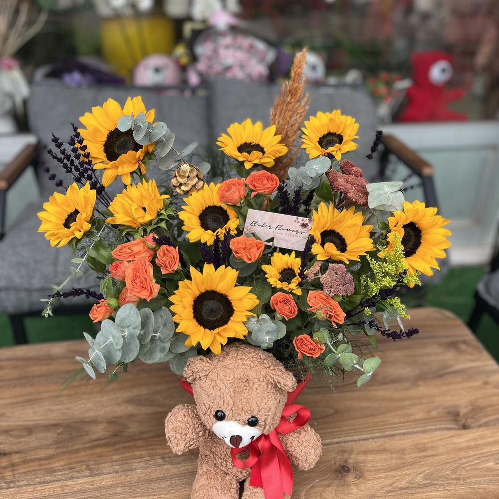 Teddy Sunflower Aranjmanı Sevdiklerinize neşe ve mutluluk katacak özel bir hediye! Bu zarif çiçek aranjmanında: • Parlak sarı güneş çiçekleri (ayçiçekleri), • Turuncu minyatür güller, • Lavanta dalları, • Gümüş rengi okaliptus yaprakları, • Doğal kuru bitki dokunuşları yer alıyor. Aranjman, sevimli bir peluş ayıcık ile tamamlanarak hem sıcak hem eğlenceli bir atmosfer yaratıyor. Bu benzersiz tasarım, doğum günleri, yıldönümleri veya “sadece seni mutlu etmek için” anları için mükemmel bir seçim! Siz de bu özel tasarımı sipariş ederek sevdiklerinizi mutlu edebilirsiniz.
