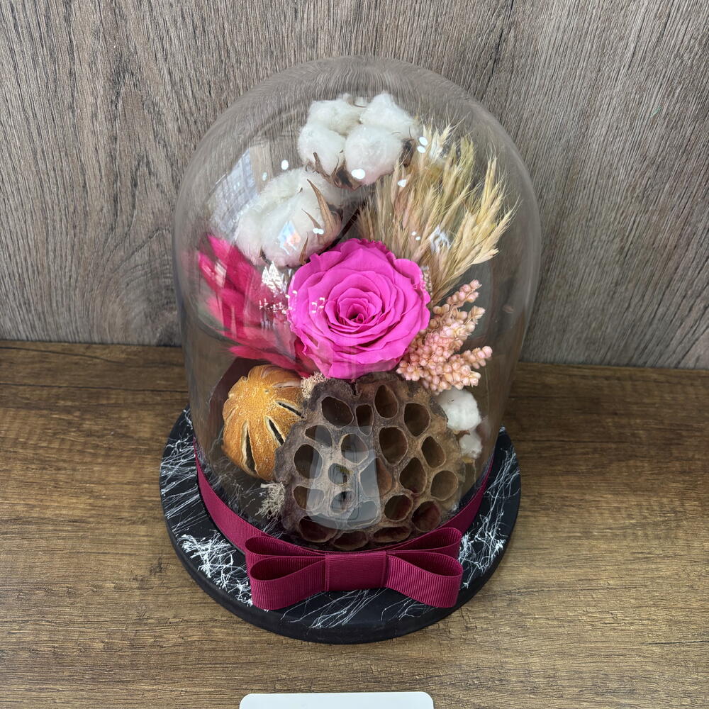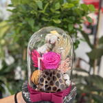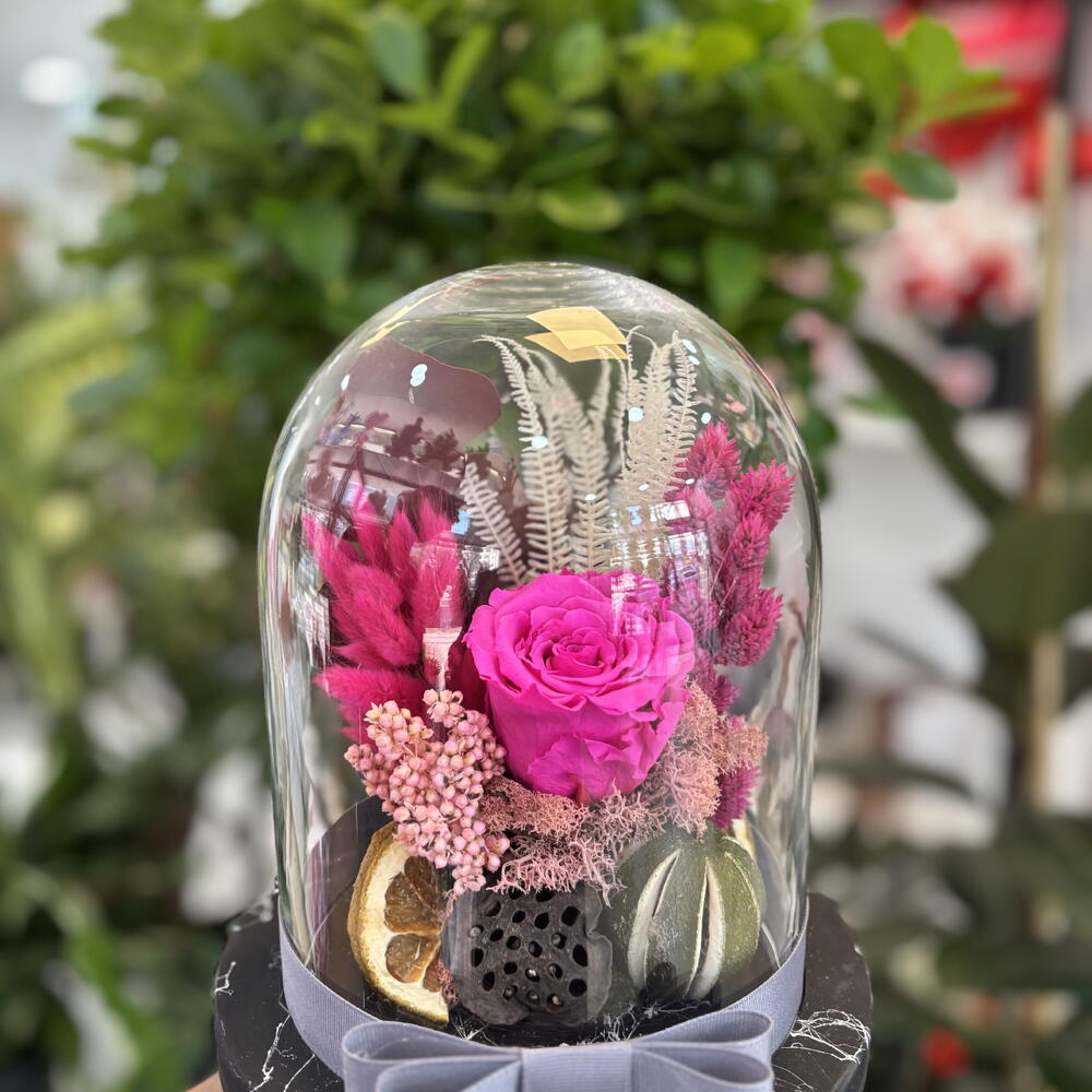 Bu çarpıcı çiçek buketi, bir adet solmayan pembe gülden, bir cam şişeden, beş dekoratif daldan, bir dekoratif kurutulmuş kireç ve dekoratif bir limon parçasından oluşmaktadır. İyi tasarlanmış ve dikkat çekici bir görünüm için mükemmeldir. Bu eşsiz çiçek buketi, evinizde doğal bir dokunuş katmak veya sevdiklerinize hediye etmek için idealdir.