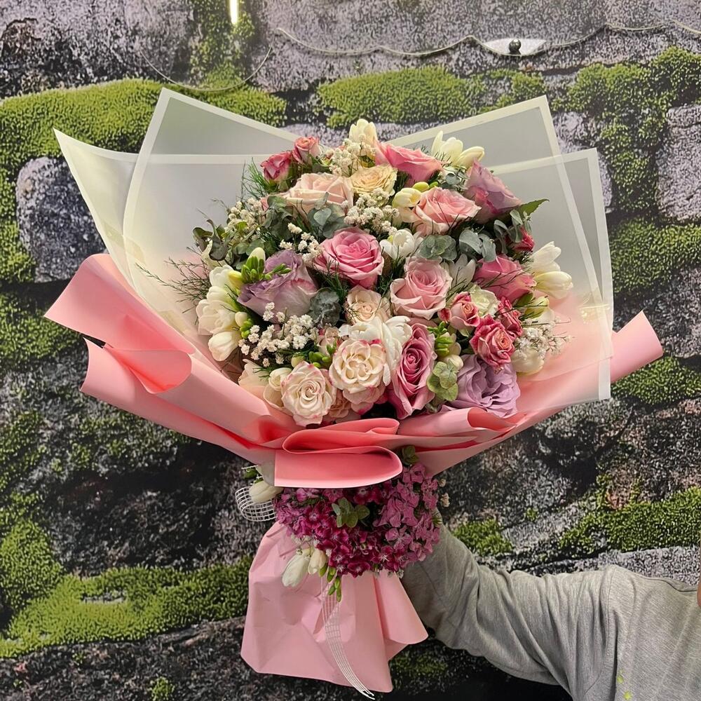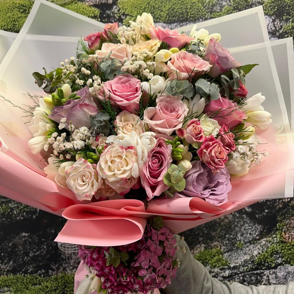 Tamamı ithal pembe güller, beyaz lisyantuslar ve pembeli sihirbaz çardak güller ile hazırlanan bu büyüleyici üçgen model büyük boy buket, lüksü ve estetiği bir araya getiriyor. 🌷✨ Pembe ve beyaz şeffaf sarım ile tasarlanan bu özel aranjman; romantik anlar, yıldönümleri, özel kutlamalar veya sevdiklerinize “iyi ki varsın” demenin en zarif yolu. 💐 💎 Tamamı ithal, premium kalitede çiçekler 🌸 Üçgen model modern tasarım ve şeffaf zarif sarım 💗 Romantik ve şık hediye arayanlar için mükemmel tercih 👉 Royal Flowers farkıyla aynı gün teslimat, tazelik garantisiyle! 🌿✨