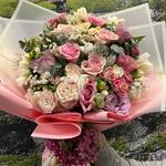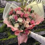 beyaz lisyantus - 10 adet çardak gül - 11 adet cipso - 15 adet hüsnü yusuf çiçeği - 6 adet okaliptus yaprağı - 8 adet pembe ithal gül - 18 adet