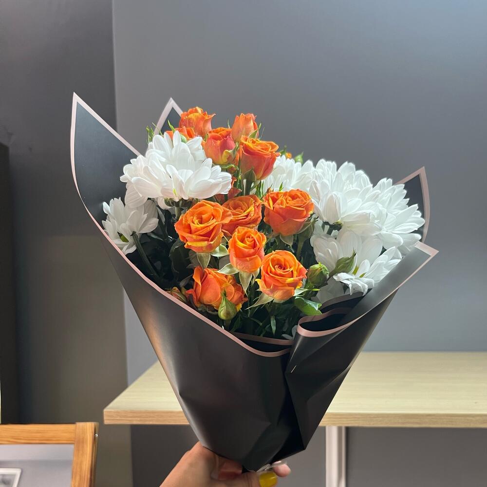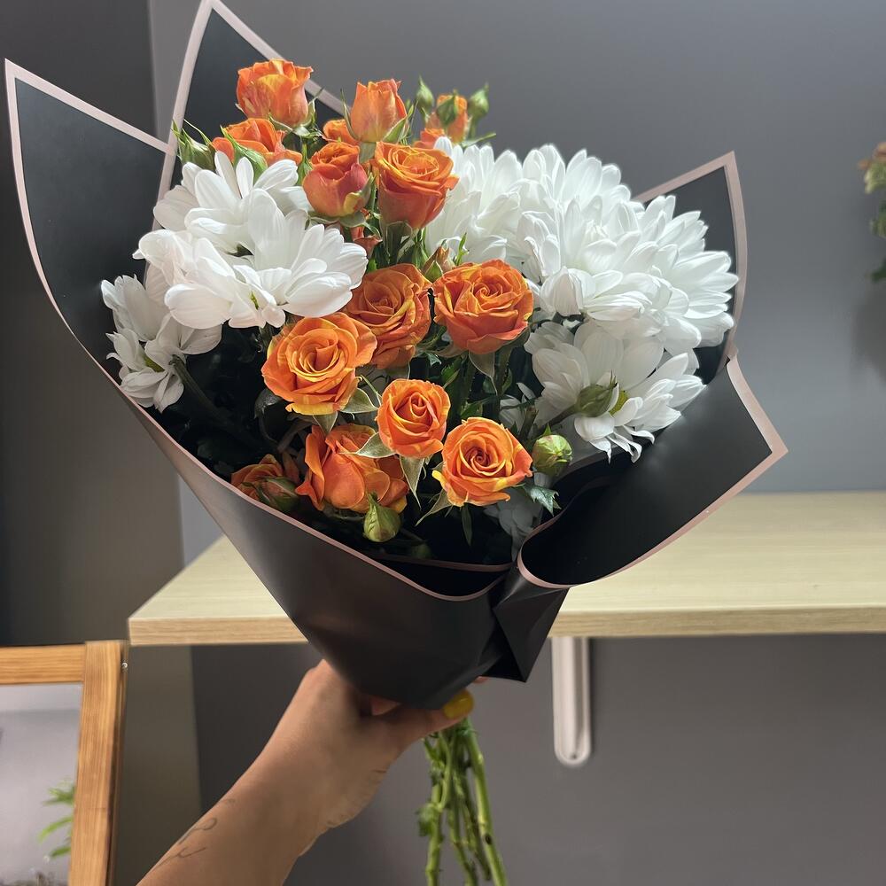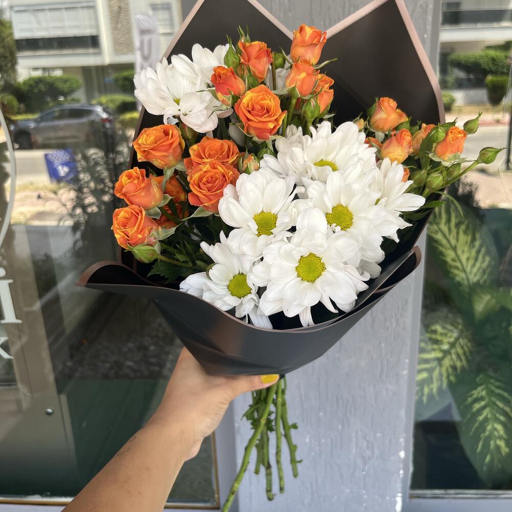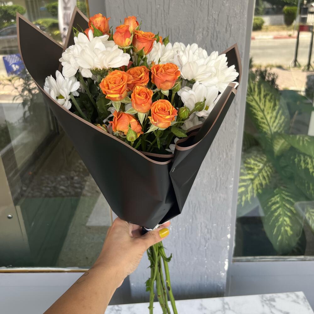 buket kağıdı - 1 adet beyaz papatya - 10 adet turuncu çardak gül - 10 adet