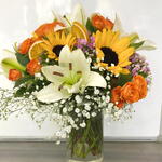 Bu canlı ve renkli çiçek aranjmanı, her ortamı neşeyle dolduracak! Sarı ayçiçekleri, beyaz zambaklar ve turuncu güller, göz alıcı bir uyum içinde bir araya geliyor. Beyaz bebek nefesi çiçekleri ve doğal portakal dilimleri, bu aranjmana zarif bir dokunuş ekliyor. Şeffaf vazo içinde sunulan bu eşsiz tasarım, her kutlama ve özel gün için mükemmel bir hediye alternatifi sunuyor. Ferah ve canlı renklerin buluştuğu bu çiçekler, sevdiklerinize anlamlı bir sürpriz yapmanızı sağlayacak. Hem modern hem de doğal tasarımıyla dikkatleri üzerine çekerken, her ortama canlılık katacaktır. Unutulmaz anlar için ideal bir seçim!