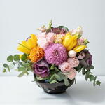Bu renkli ve canlı çiçekler, her mekana neşe katacak şekilde tasarlanmıştır. Sarı laleler, mor krizantem, yumuşak pembe güller ve mor lahana çiçekleri ile zenginleştirilmiş olan bu buket, görsel bir şölen sunar. Ayrıca, buketteki yeşil eukaliptüs dalları, tüm düzenlemeye ferah bir hava katarak doğallığı vurgular. Özellikle bahar ve yaz aylarında iç mekanlarda taze bir hava yaratmak için mükemmel bir tercihtir. Çeşitli renklerin ve dokuların uyumlu birleşimi, hem görsel hem de duygusal olarak tatmin edici bir hediye sunar. Buketinizi serin ve doğrudan güneş ışığı almayan bir yerde tutun. Her gün suyun değişmesi, çiçeklerin uzun süre taze kalmasına yardımcı olur. Buketinizi sularken, suyun çiçeklerin üzerine dökülmemesi gerektiğine dikkat edin. Ayrıca, her 2-3 günde bir sap uçlarını kesmek, ömrünü uzatacaktır.
