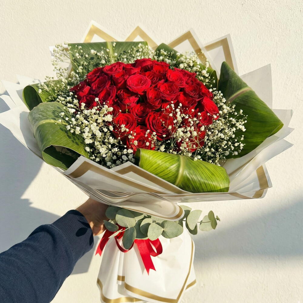 Bu zarif ve etkileyici çiçek buketi, 1 adet kırmızı gül, 50 cipsofilya çiçeği, 15 beyaz buket kağıdı ve 6 adet canlı yeşil starliçe yaprağıyla tasarlanmıştır. Kırmızı gül, sevgi ve tutkuyu simgelerken, cipsofilya çiçekleri zarif bir dokunuş sağlar ve starliçe yaprakları buketin doğal güzelliğini tamamlar. Beyaz buket kağıdı ise zarif bir estetik katmaktadır. Bu muazzam buket, özel günlerde, sevdiğiniz kişiye olan duygularınızı zarif bir şekilde ifade etmek için mükemmel bir seçenektir. Evinizde veya ofisinizde şıklığı ve zarafeti simgeleyen bu buket, her ortamı aydınlatacaktır. Çiçeklerin solmaması için düzenli olarak suyu değiştirmeli ve doğrudan güneş ışığından uzak tutmalısınız.