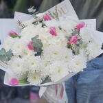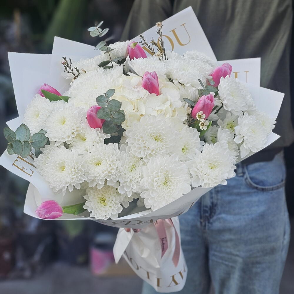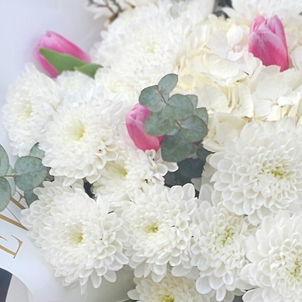 Bu muhteşem Karışık Buket, 7 adet beyaz krizantem, 7 adet pembe lale, 5 adet Wax çiçeği ve 5 adet okaliptüs dalı ile hazırlandı. Tazeleyici okaliptüsün eşsiz kokusu, pembe lalelerin canlı enerjisi ve zarif beyaz krizantemlerin saf güzelliği bu buketi mükemmel hale getirir. 5 Wax çiçeği ise bu doğal kompozisyonu tamamlar. İster sevdiklerinize hediye edin, ister evinizin dekorasyonunda kullanın, bu buket her zaman göz dolduracak.