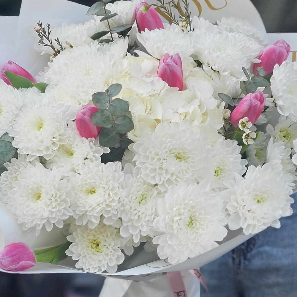 Wax flower - 5 adet white chrysanthemum - 7 adet pink tulips - 7 adet okaliptüs dalı - 5 adet