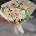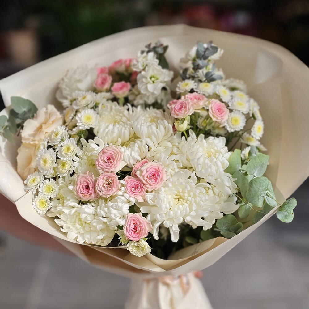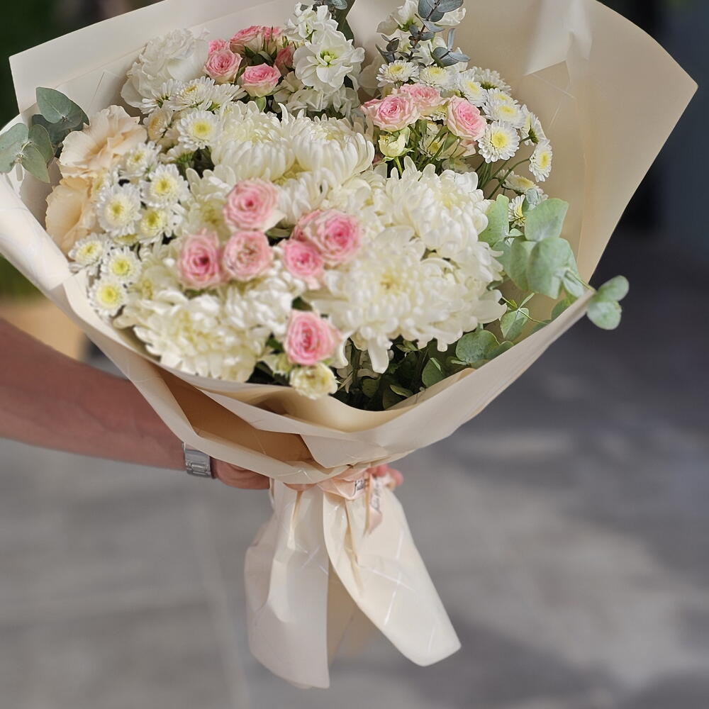 Beyaz krizantemlerin 5 adet, sprey güllerin 3 adet ve beyaz eustomaların 3 adet hoş birlikteliği ile tasarlanmış, Karışık Buket. Bu özenle hazırlanmış buket, doğanın zarif renk ve dokularını evinize ve sevdiklerinize taşır. İster özel günlerinizde, ister sadece sevdiklerinizi gülümsetmek için tercih edin. Her bir çiçeği özenle seçilmiş bu karışık buket, kalıcı izler bırakır.
