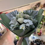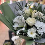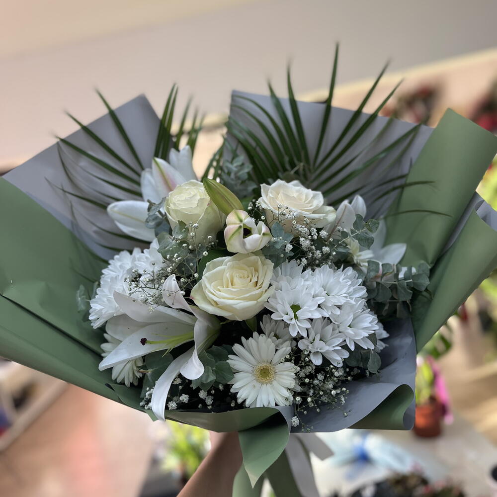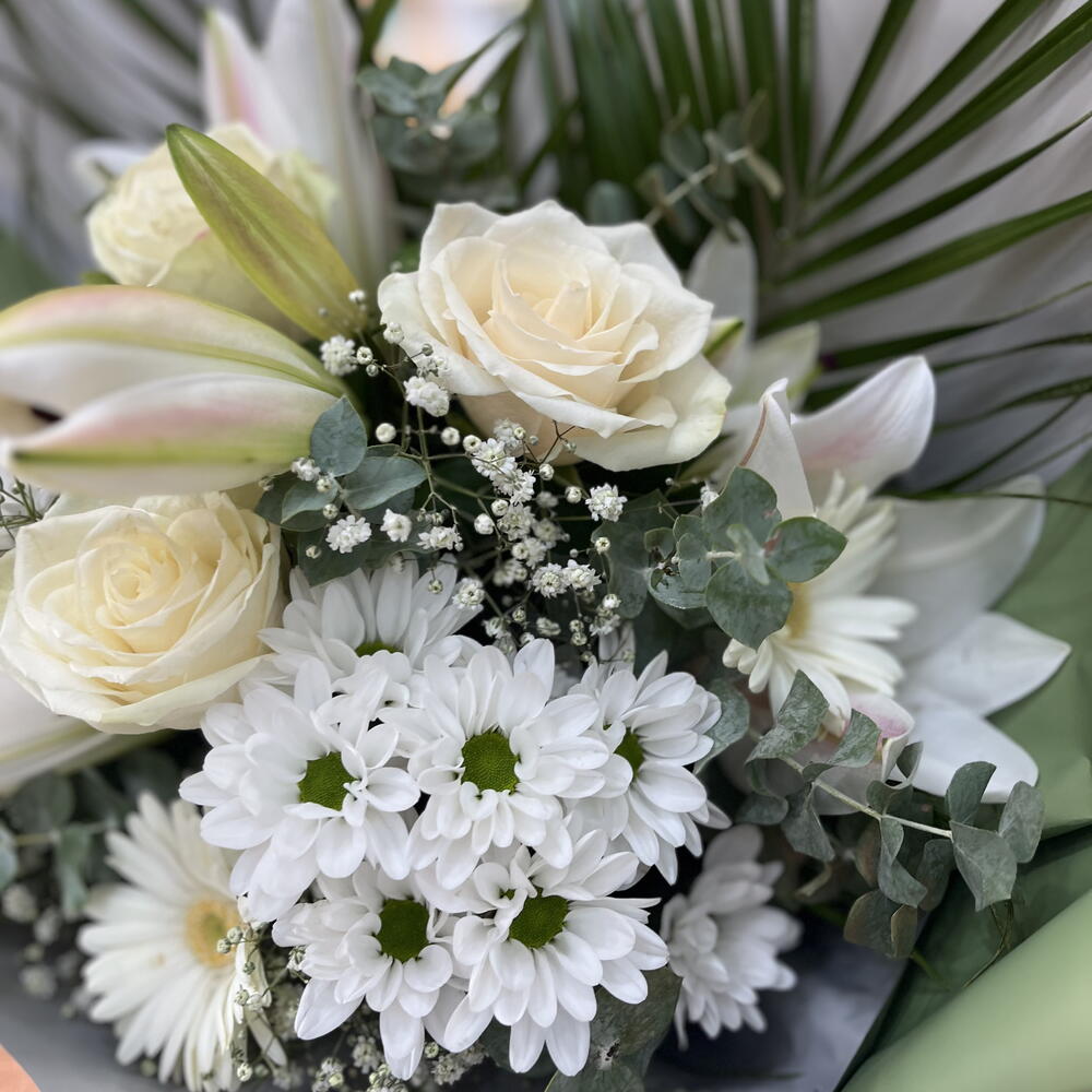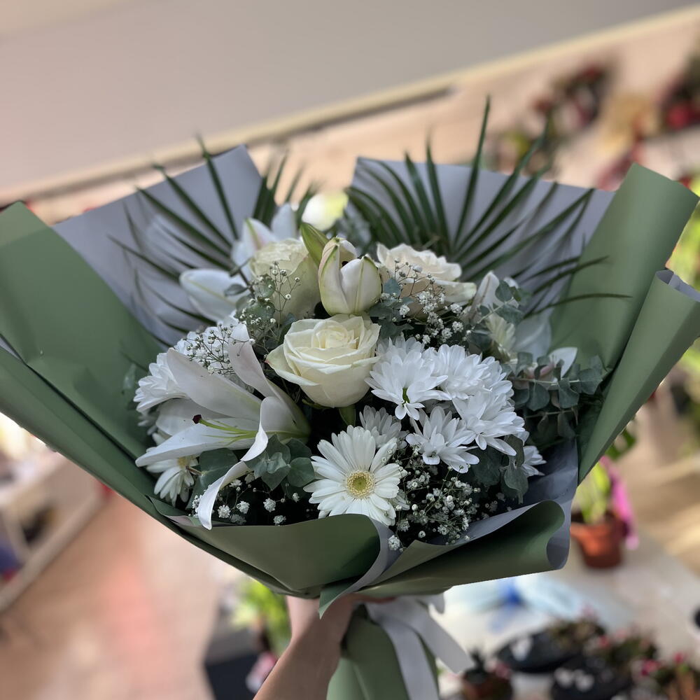 White rose - 3 adet White lilies - 5 adet white Gerbera - 3 adet white daisy - 30 adet ocaliptus - 15 adet