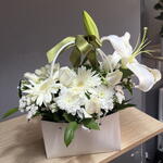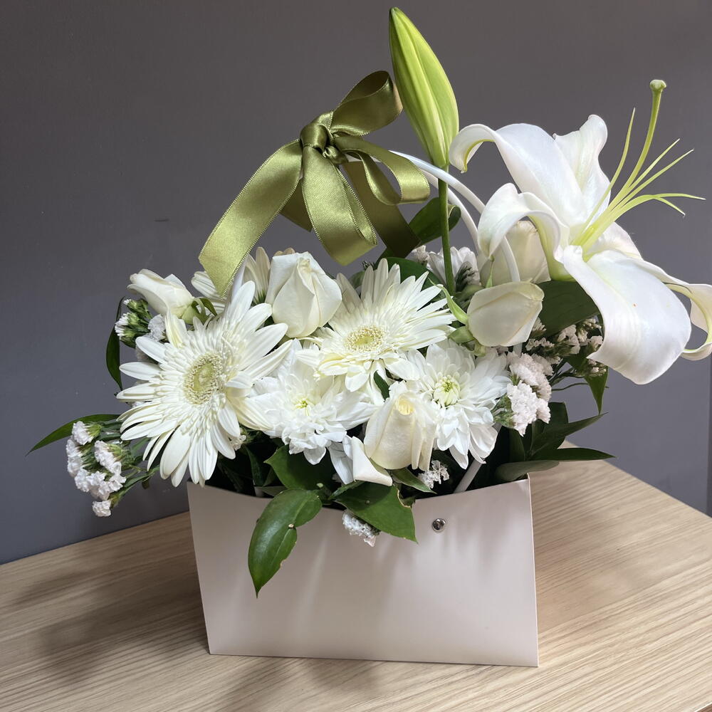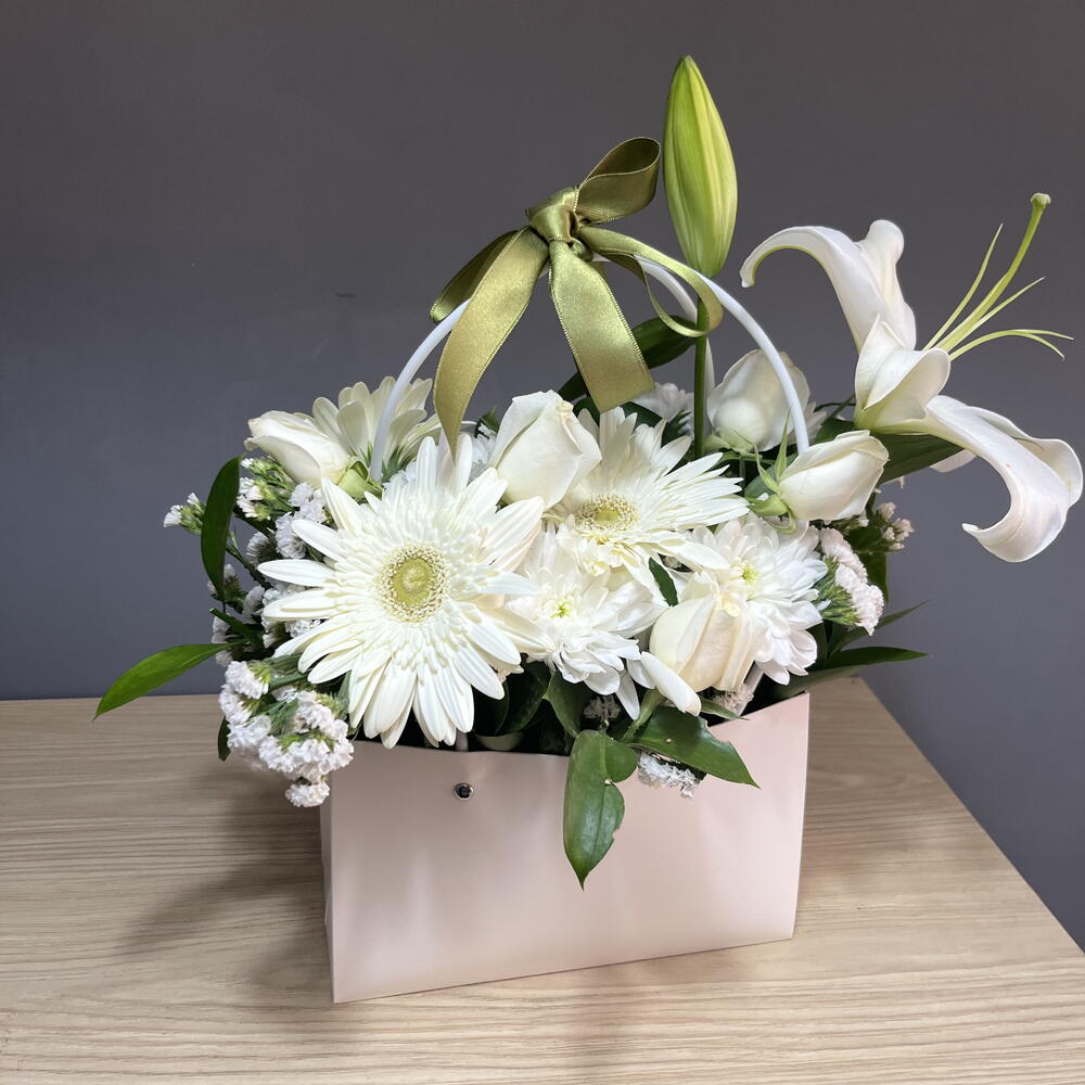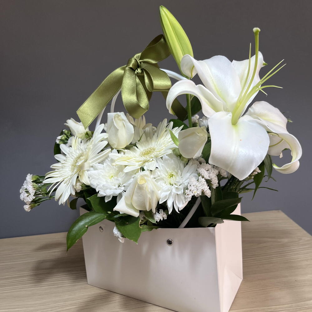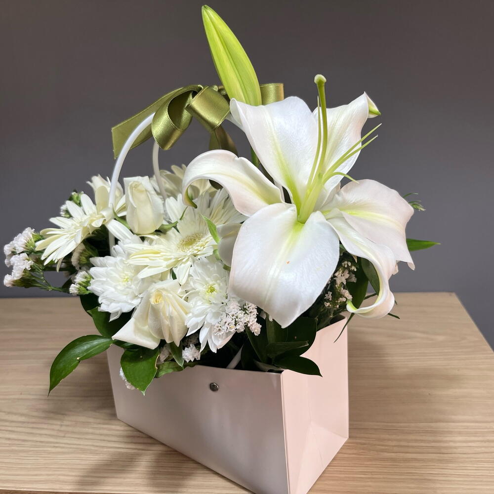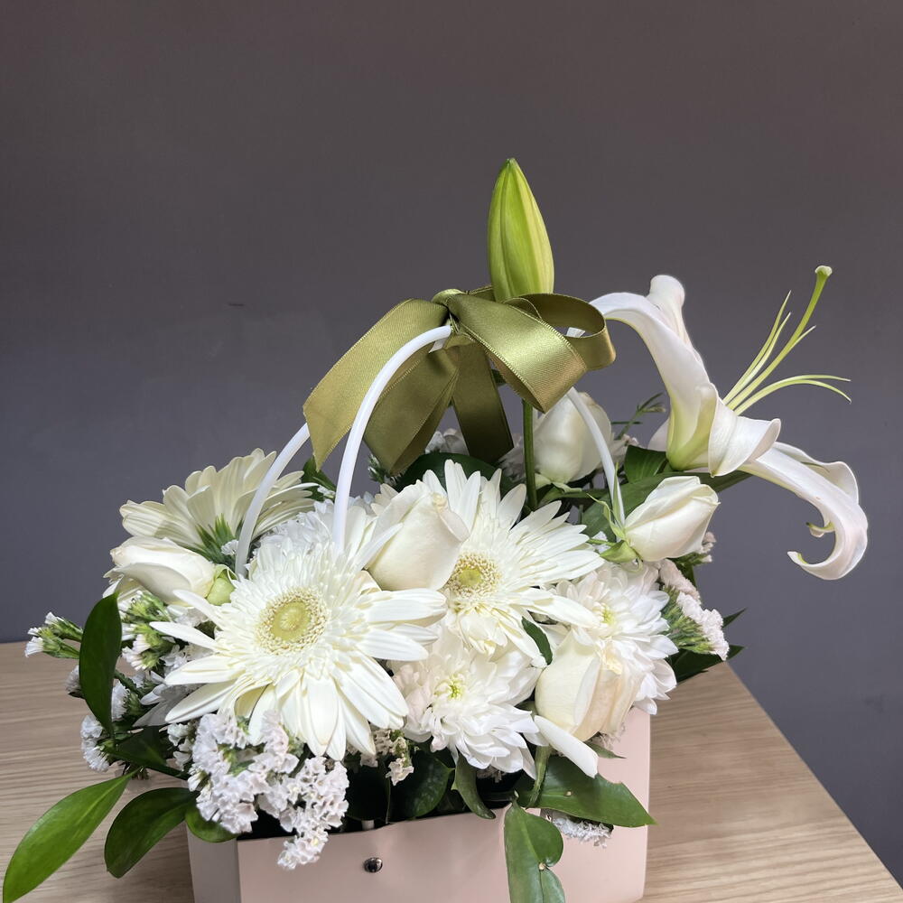 Featuring pure white lilies, roses, and gerberas — perfectly arranged with lush greens in a chic white box. Elegant, timeless, and serene. Crafted with love in Antalya by SEMENİ Flowers. Perfect for weddings, sympathy, or simply to brighten someone’s day. 🤍