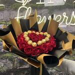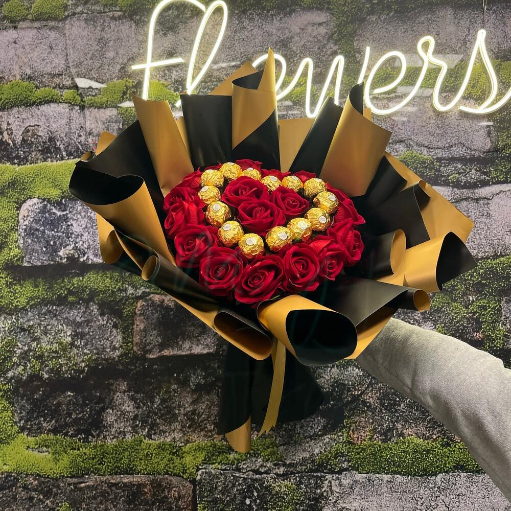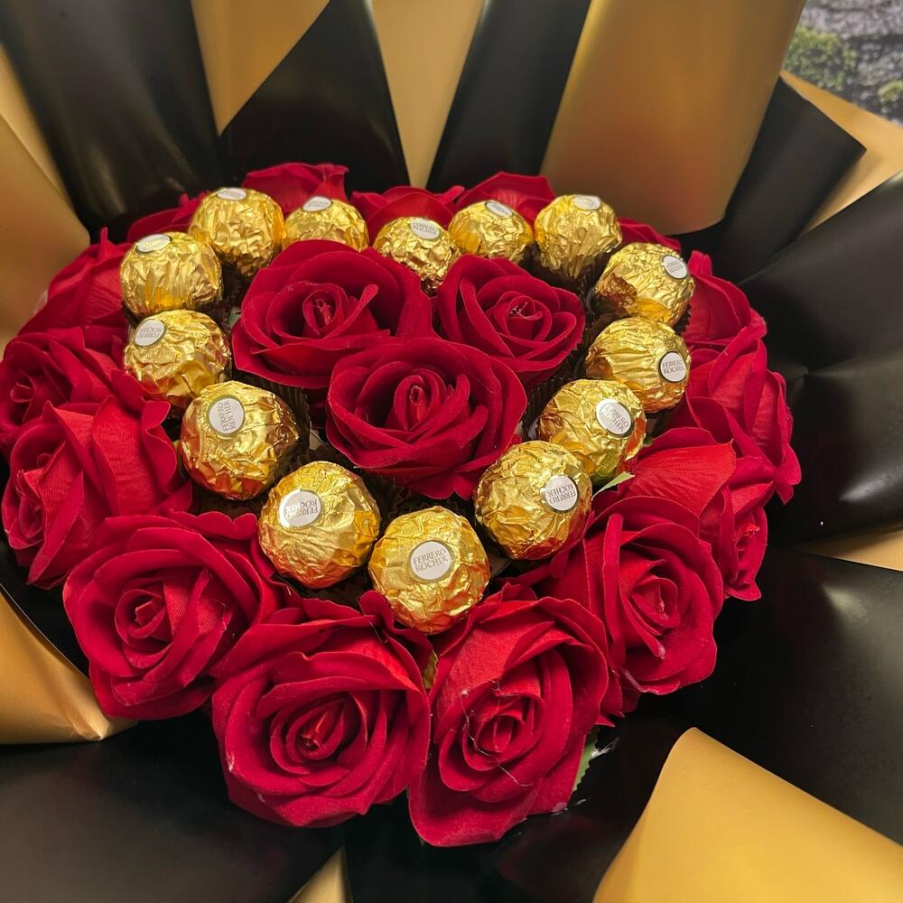 Başlık: Aşkın ve Lezzetin Buluştuğu Özel Buket Açıklama: 20 adet zarif kırmızı yapay gül ve 20 adet enfes Ferrero Rocher çikolatasının birleşimiyle hazırlanan bu özel buket, hem göz kamaştıran bir hediye hem de tatlı bir sürprizdir. Sevdiklerinize kalıcı bir hatıra bırakmak ve onlara unutulmaz bir lezzet sunmak için mükemmel bir seçim!
