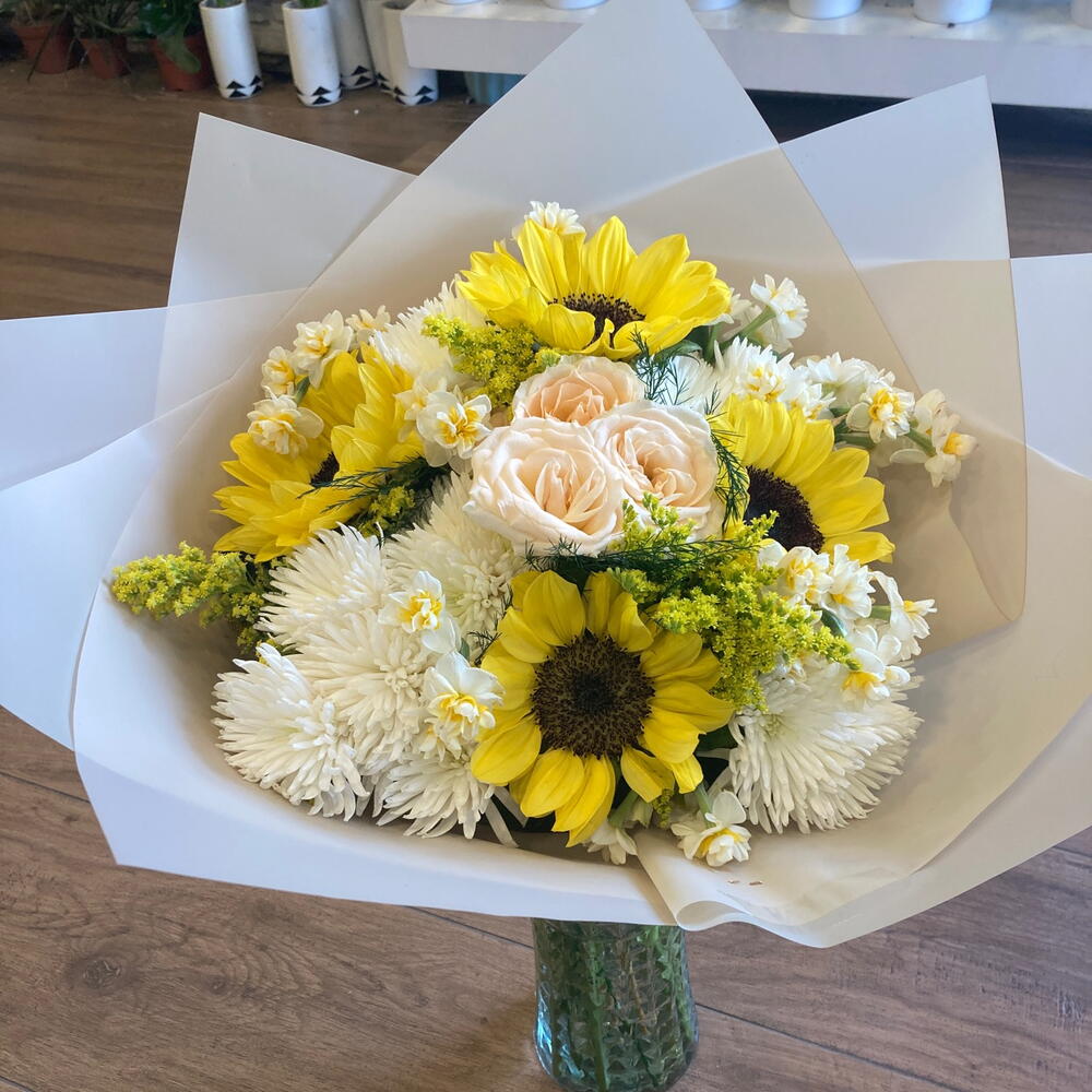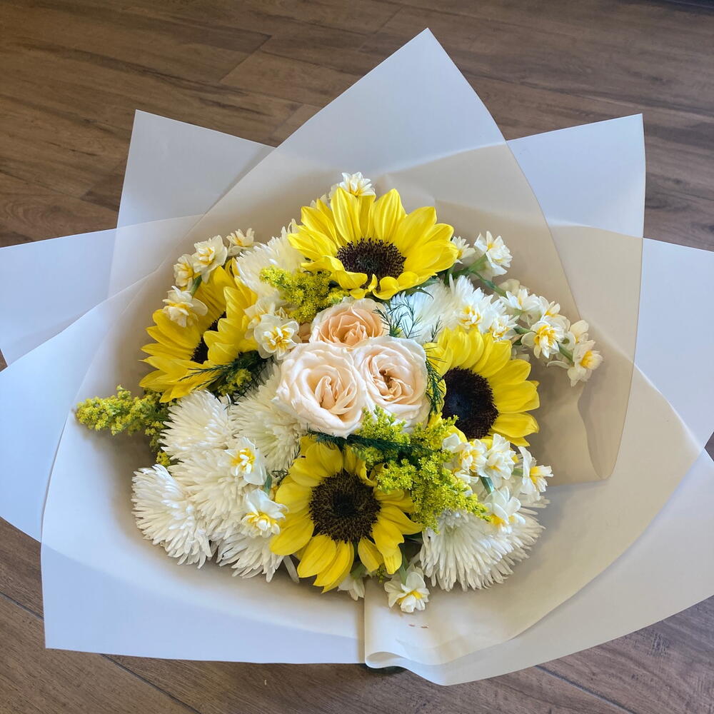 solidaster - 3 adet ayçiçeği - 4 adet nergis - 10 adet beyaz kasımpatı - 15 adet somon çardak gül - 4 adet