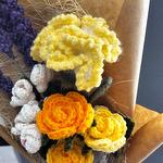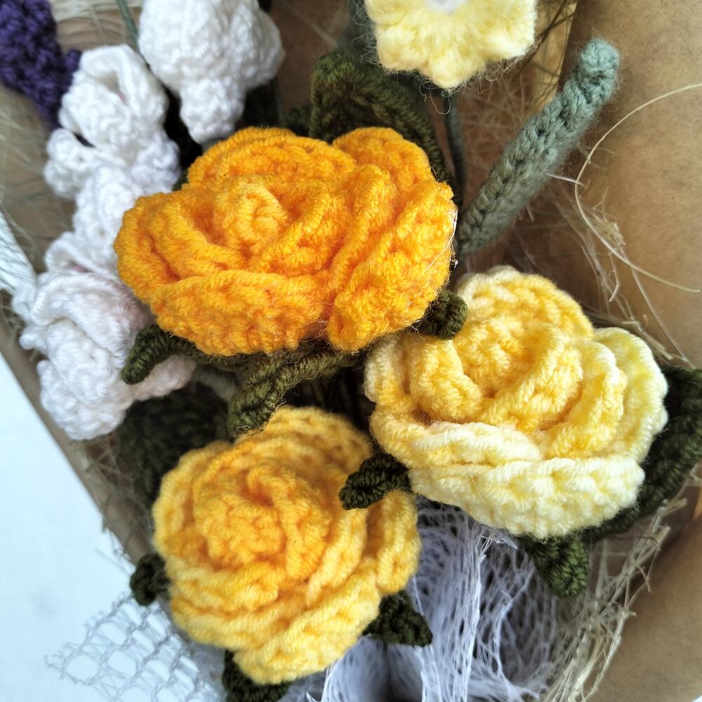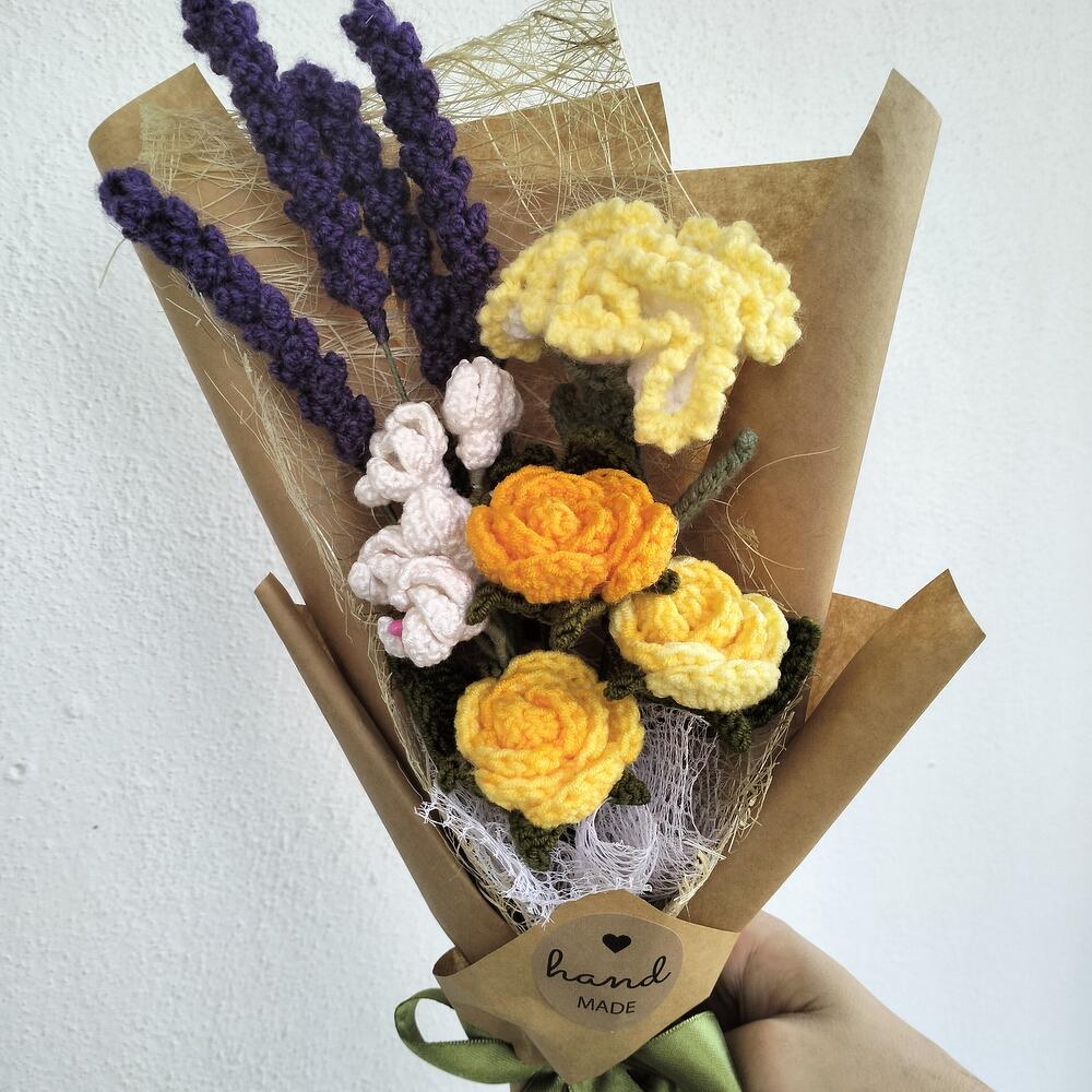 Knitted with acrilic and coton yarn. İN THE BOUQUET 1 PCS multihead mini roses 1 PCS carnation 2 PCS white mini flowers 4 PCS lavander