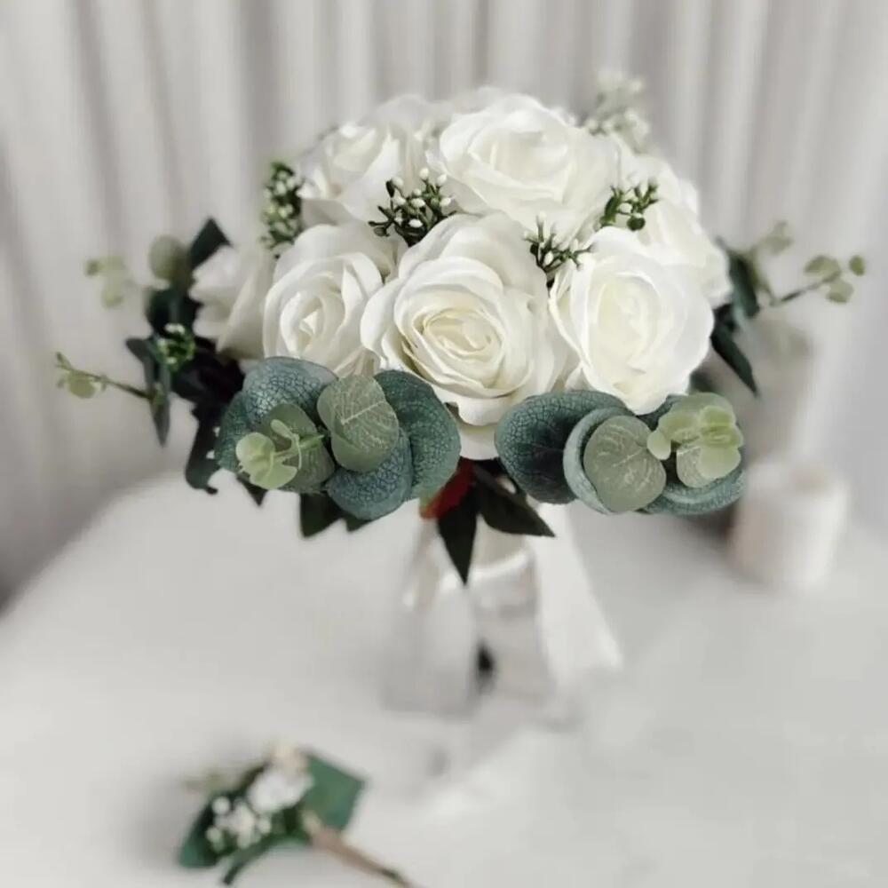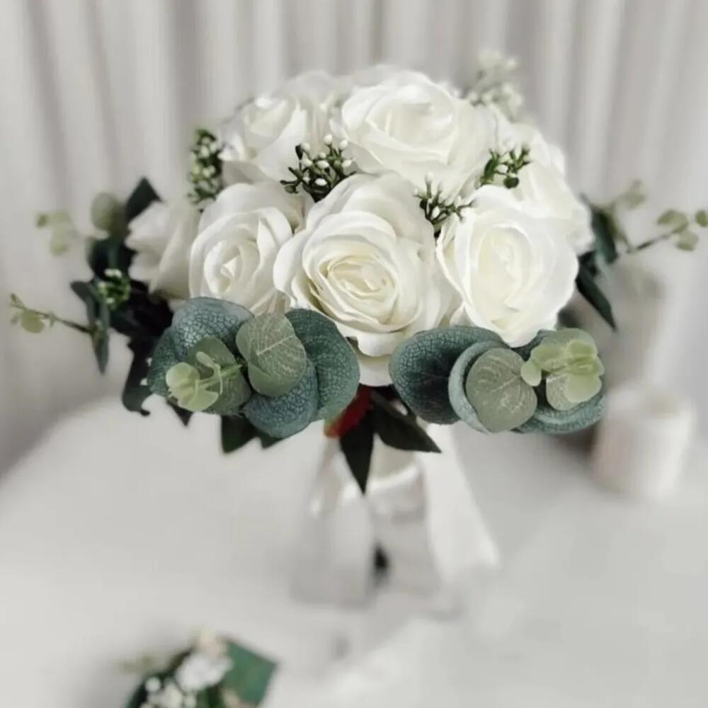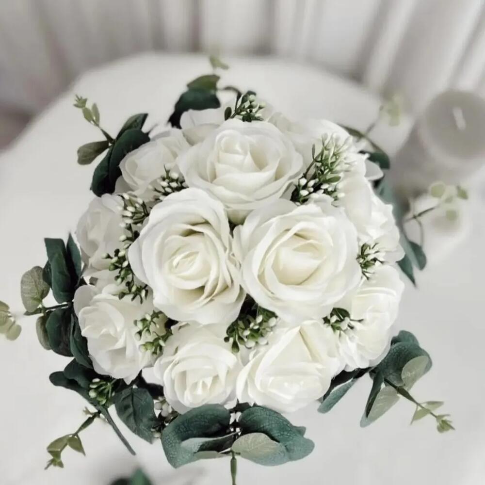 buketlerimizde kullandığımız çiçekler kaliteli ve dayanıklı çiçekler olup evinizde güzel bir dekor oluşturmaya ve anılarınızın saklanmasına yardımcı olur. Kadınlar Günü, Sevgililer günü, anneler günü, doğum günü, öğretmenler günü, yılbaşı vb.özel günleriniz için tercih edebilirsiniz..Siz de ithal kumaş çiçeklerle tasarlağımız buketinizi evinizde güzel vazoları süslemek için kullanmak istemez misiniz? Ürün içeriği 12 adet beyaz gül ve 9 adet okaliptustan oluşmaktadır. ebat 30-35 civarındadır.