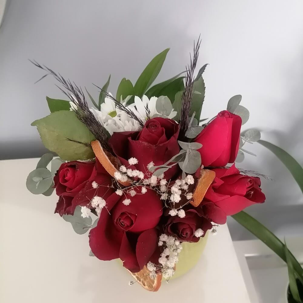 Bu büyüleyici çiçek buketi, 7 adet romantik kırmızı gül, 4 adet ferahlatıcı yeşillik, 7 adet masum beyaz papatya ve 2 adet tatlı portakal diliminden oluşur. Tüm bu güzellikler, şıklığı tamamlayan 1 adet yeşil vazo içerisine ustaca yerleştirilmiştir. Bu çiçek buketi, sevdiklerinizi şımartmak ve özel günleri unutulmaz kılmak için mükemmel bir seçimdir.