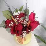 kırmızı gül - 7 adet yesillik - 4 adet papatya beyaz - 7 adet portakal dilimi - 2 adet yeşil vazo - 1 adet