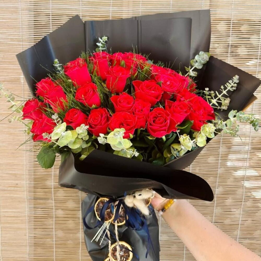 okaliptüs - 4 adet dekoratif yeşillik - 4 adet kırmızı gül - 25 adet