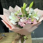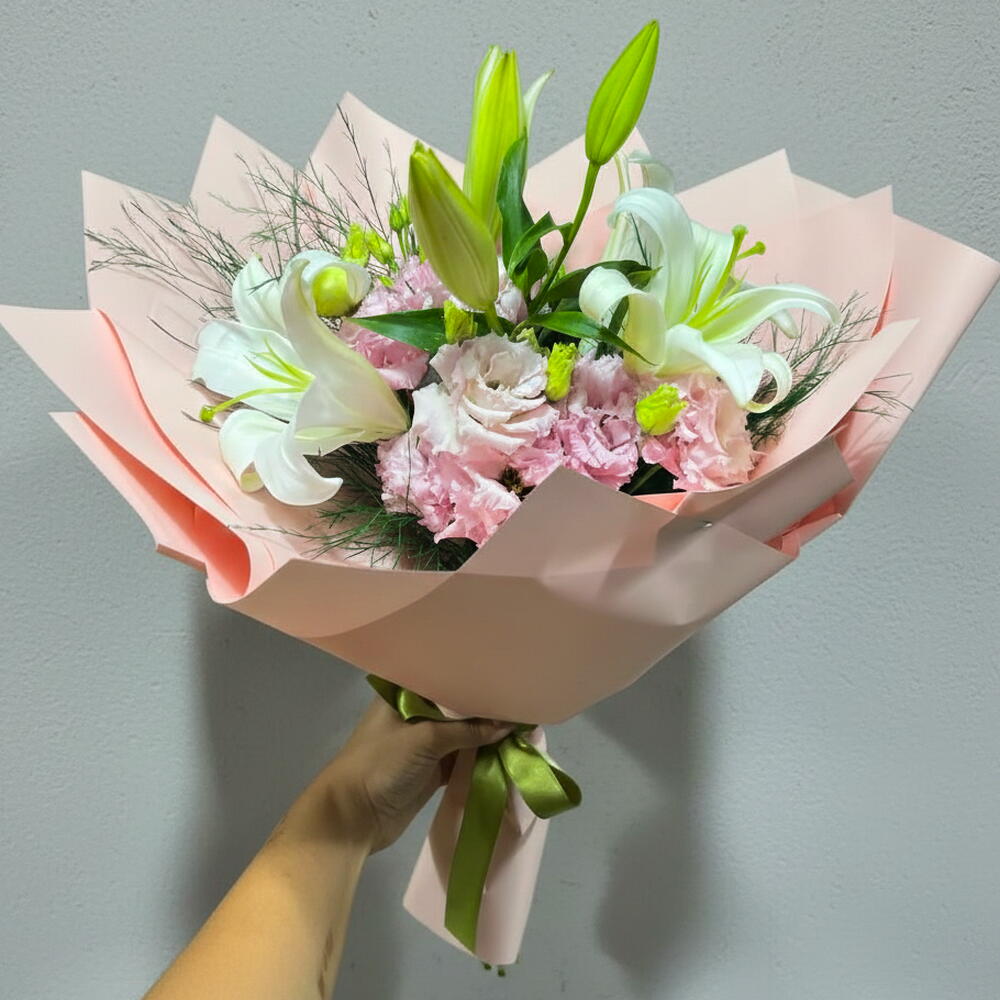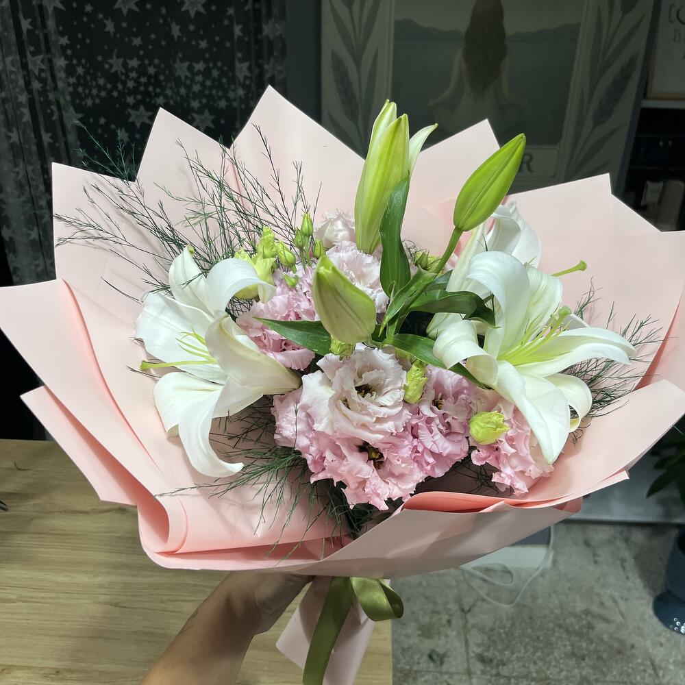 lilyum beyaz - 4 adet lisyantus pembe - 8 adet buket kâğıdı - 4 adet