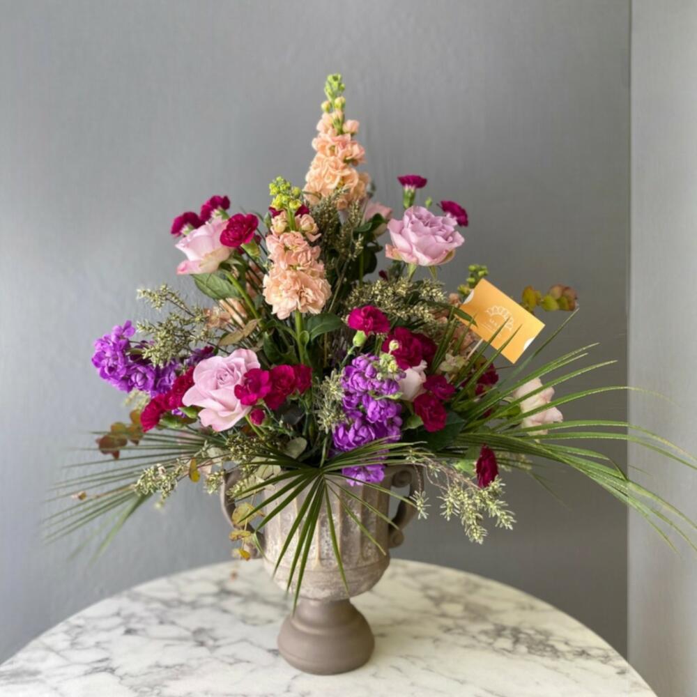 Zarif detaylarla bezeli bu özel tasarım vazo aranjmanı, şıklığı ve romantizmi bir araya getiriyor. Mor ve somon tonlarında şebboylar, lila güllerin yumuşak dokunuşu ve fuşya karanfillerin çarpıcı kontrastıyla buluşuyor. Doğal garnitürler ve yeşil yapraklarla tamamlanan bu çiçek düzenlemesi, her ortama zarif bir dokunuş katmak için hazır. Bakım Önerisi: Aranjman su içerisinde yer aldığı için her 2-3 günde bir suyunu değiştirmeyi unutmayın. Vazonun içini temiz suyla doldurarak çiçeklerin tazeliğini koruyabilirsiniz. Serin, doğrudan güneş almayan bir alanda konumlandırmak ömrünü uzatır. Yapraklara su püskürtmek çiçeklerin canlı kalmasına yardımcı olur.