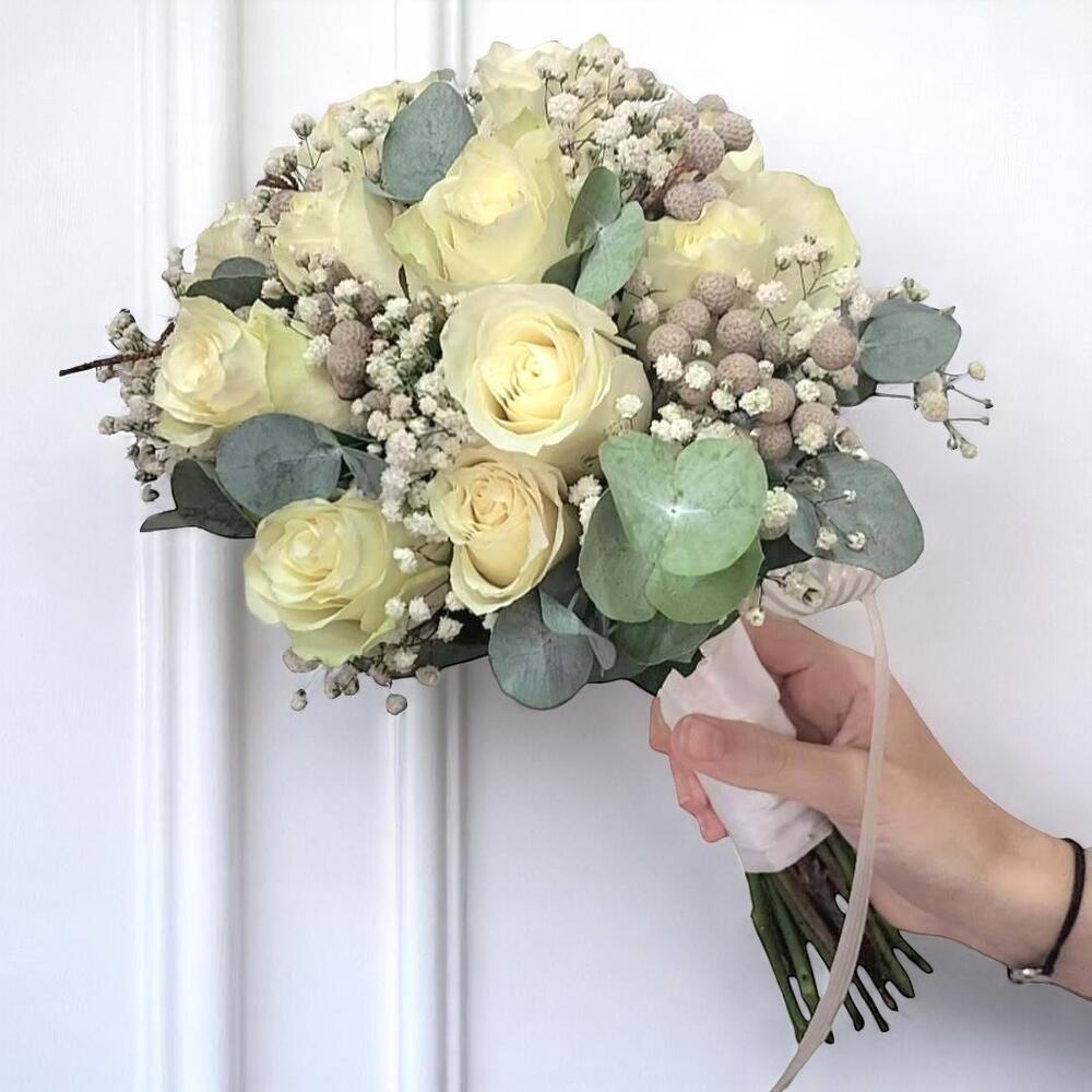 Zarifliğin ve sadeliğin birleştiği bu “Beyaz Gül Gelin Buketi”, modern ve klasik tarzı bir araya getirerek her gelin için kusursuz bir tamamlayıcıdır. 11 adet beyaz ithal gül, 7 dal cipsofilya (gelin çiçeği), 5 dal kuru başak ve 6 dal okaliptüs ile doğal bir uyum yakalanmıştır. Şık saten kurdele ile sarılmış saplar, tutuş kolaylığı sunarken görsel bütünlüğü de tamamlar. Düğün, nişan ve özel çekimler için vazgeçilmez olan bu gelin buketi, aynı zamanda sade dekorasyon sevenler için estetik bir aranjmandır. Bakım Önerisi: Buketinizin daha uzun ömürlü olması için çiçekleri serin, doğrudan güneş ışığı almayan bir ortamda muhafaza edin. Sapları suya temas ettirmeden, nemli pamuk ile sarılı şekilde taze tutabilirsiniz. Düğün sonrası vazoda soğuk suyla muhafaza ederek birkaç gün daha tazeliğini koruyabilirsiniz. Aşırı sıcak ya da kuru ortamlardan uzak tutun.