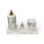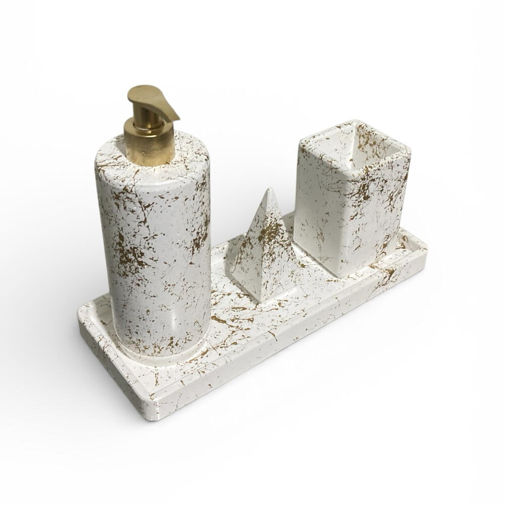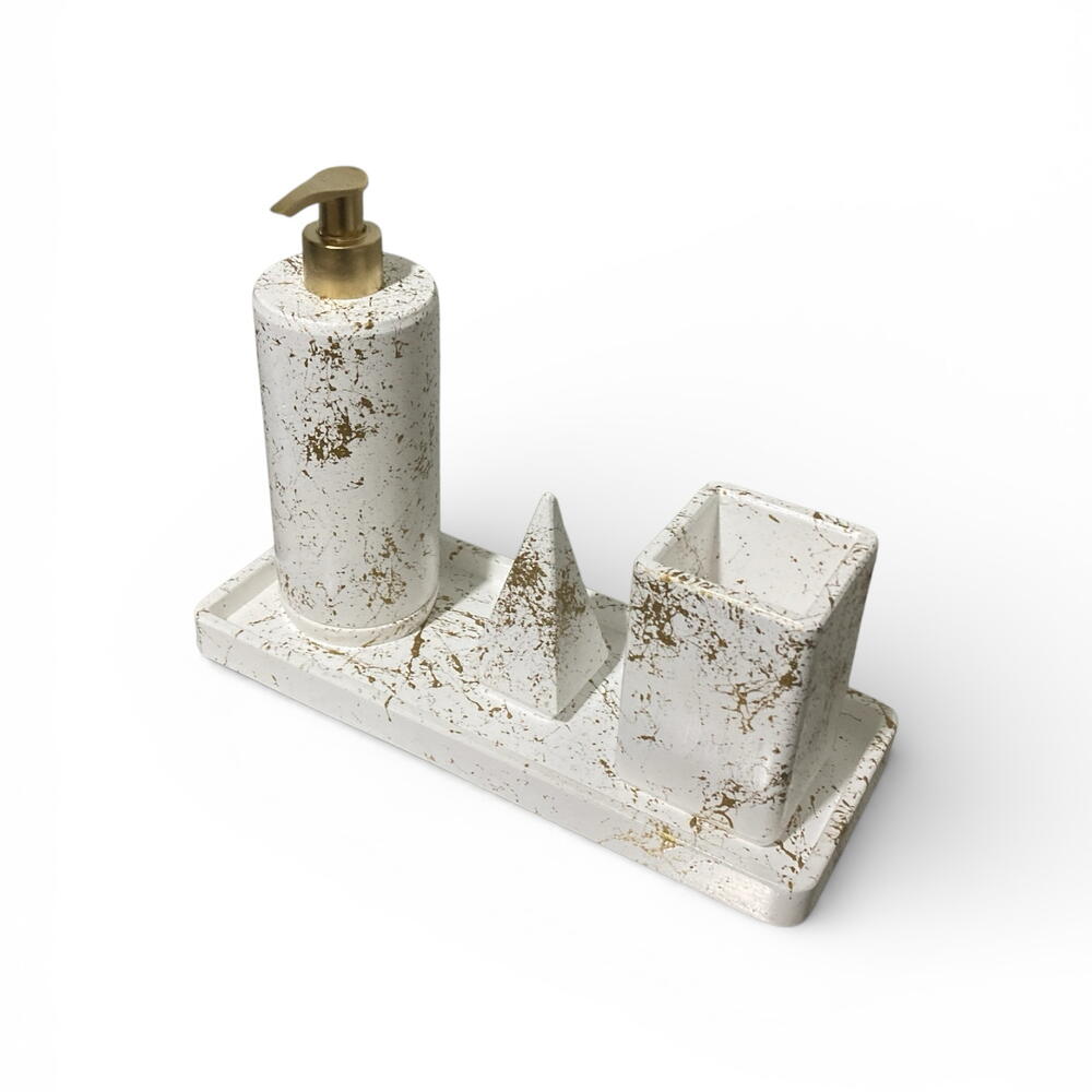 4 Parça Vernikli Taş Tozu Banyo Aksesuar Seti - Altın Varank & Beyaz Banyonuzun havasını değiştirecek, dayanıklı ve estetik bir set arıyorsanız doğru yerdesiniz. Taş tozunun doğal dokusunu, koruyucu vernik ile birleştirerek uzun ömürlü bir kullanım sunduk. Geometrik formları ve özgün deseniyle hem modern hem de endüstriyel dekorasyonlara mükemmel uyum sağlar. Set İçeriği: • 1 Adet Sıvı Sabunluk: Şık altın varank pompa detayıyla. • 1 Adet Diş Fırçalık: Geniş hacimli ve estetik. • 1 Adet Dekoratif Piramit Obje: İster yüzük standı olarak kullanın, ister dekoratif bir dokunuş olarak. • 1 Adet Sunum Tepsisi: Tüm parçaları bir arada tutan, düzenleyici altlık.