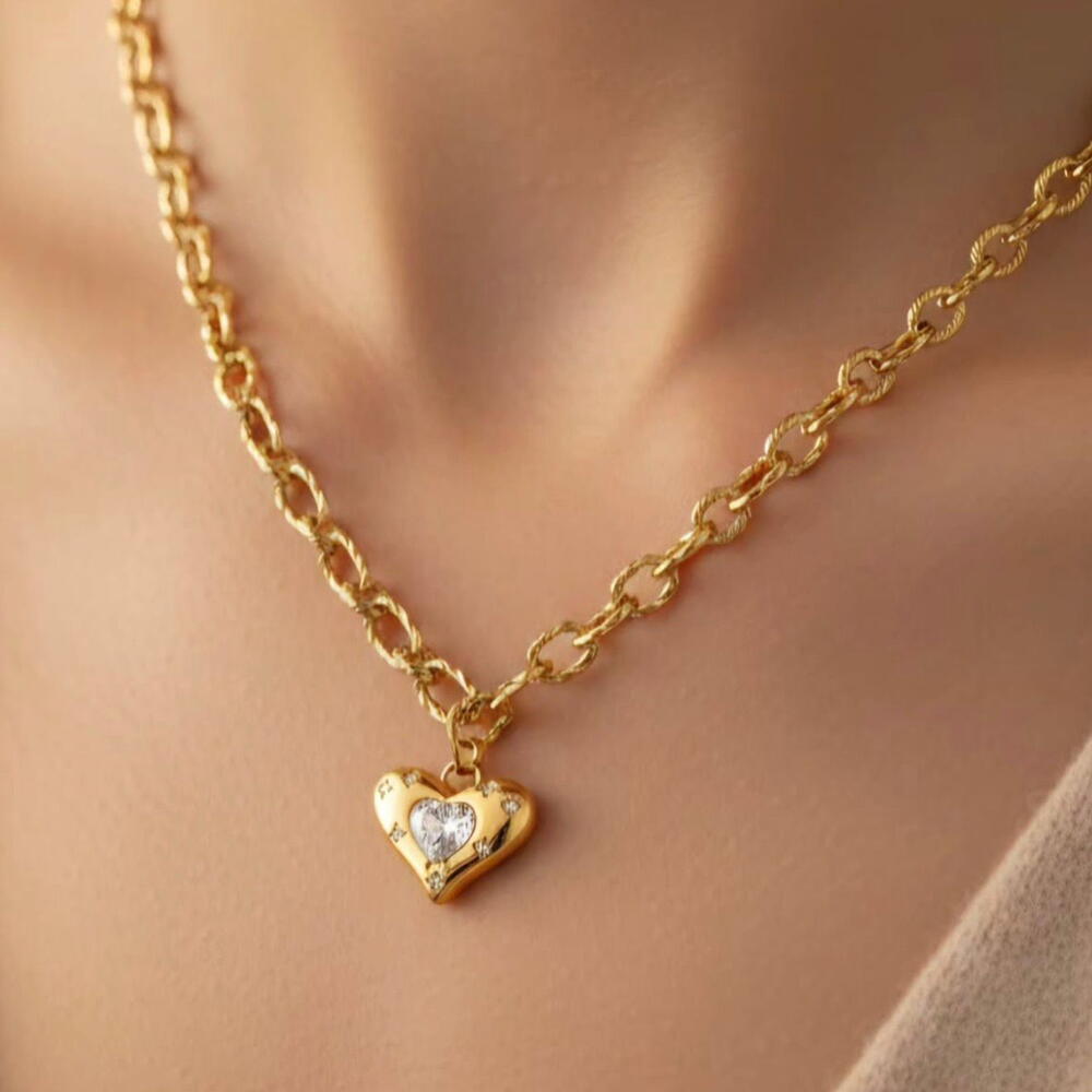 Sevginin en saf ve ışıltılı sembolü olan bu altın kaplama kalp kolye, romantizmi modern bir zarafetle boynunuza taşıyor. Kalp formunun merkezindeki elmas ışıltısına sahip taşlar, ışığı her açıdan mükemmel bir şekilde yansıtarak stilinize büyüleyici bir parıltı katar. Altın kaplamanın sıcak tonuyla birleşen bu göz alıcı tasarım, zamansız bir şıklığın kapılarını aralıyor. Her detayıyla incelik ve tutkuyu simgeleyen bu parça, hem günlük kombinlerinize naif bir dokunuş katmak hem de en özel anlarınızda parlamak için ideal. Kendinizi şımartmak veya sevdiklerinizin kalbine dokunacak kalıcı ve anlamlı bir hediye sunmak istiyorsanız, bu ışıltılı kalp tasarımı mükemmel bir tercih.
