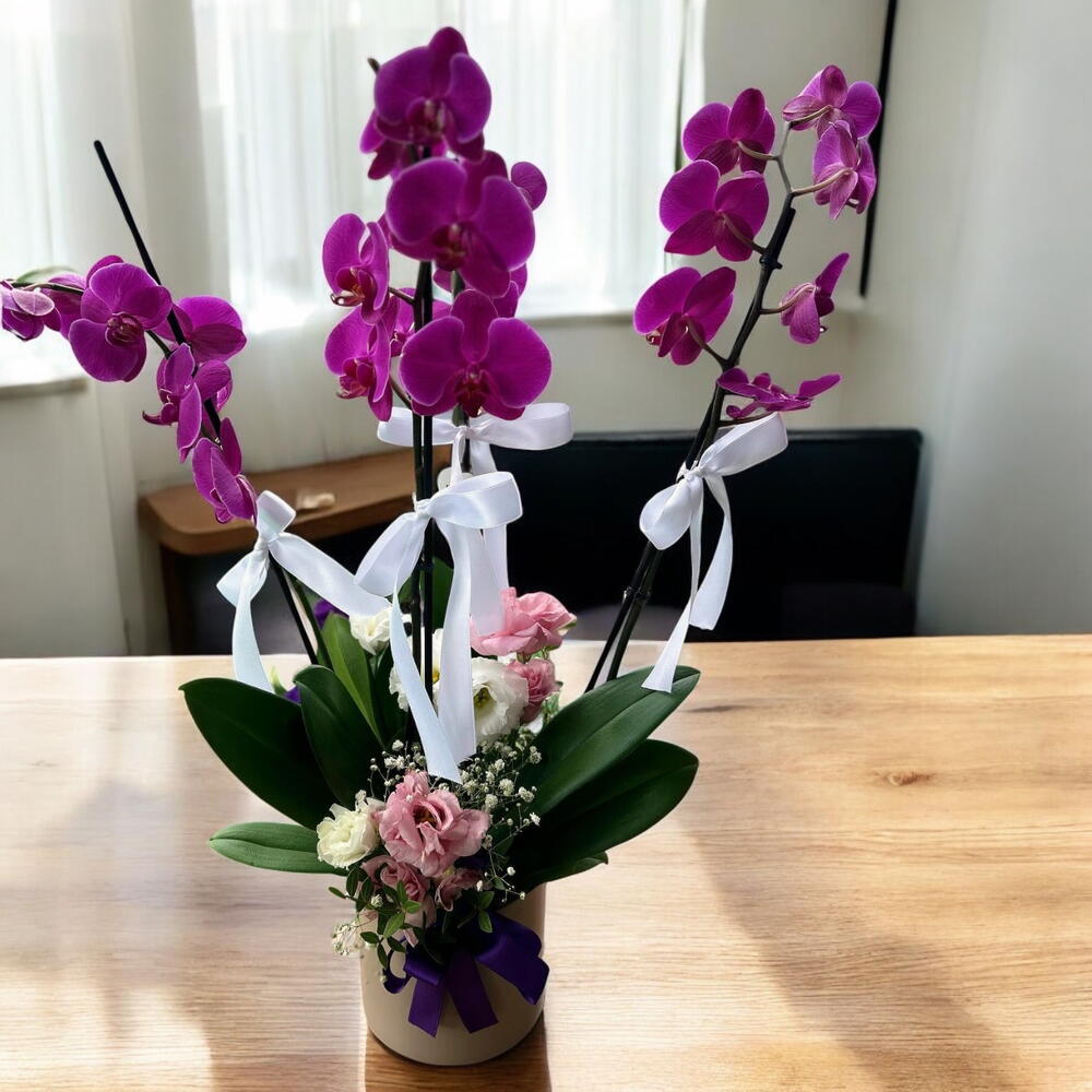 Mor orkide ve lisyantus çiçeklerinden oluşan aranjman, zarif ve şık bir görünüm sunar. Mor orkide, lüks ve zarafeti simgelerken, lisyantus çiçekleri ise sadeliği ve şıklığıyla bu kompozisyona sıcaklık katar. Bu aranjman, hem iç mekanlarda hem de özel etkinliklerde göz alıcı bir dekoratif unsur olarak kullanılabilir. İki farklı çiçeğin uyumu, romantik ve sofistike bir atmosfer yaratır. Kalıcı bir hediye arayanlar için bu aranjman doğru bir tercih olacaktır.