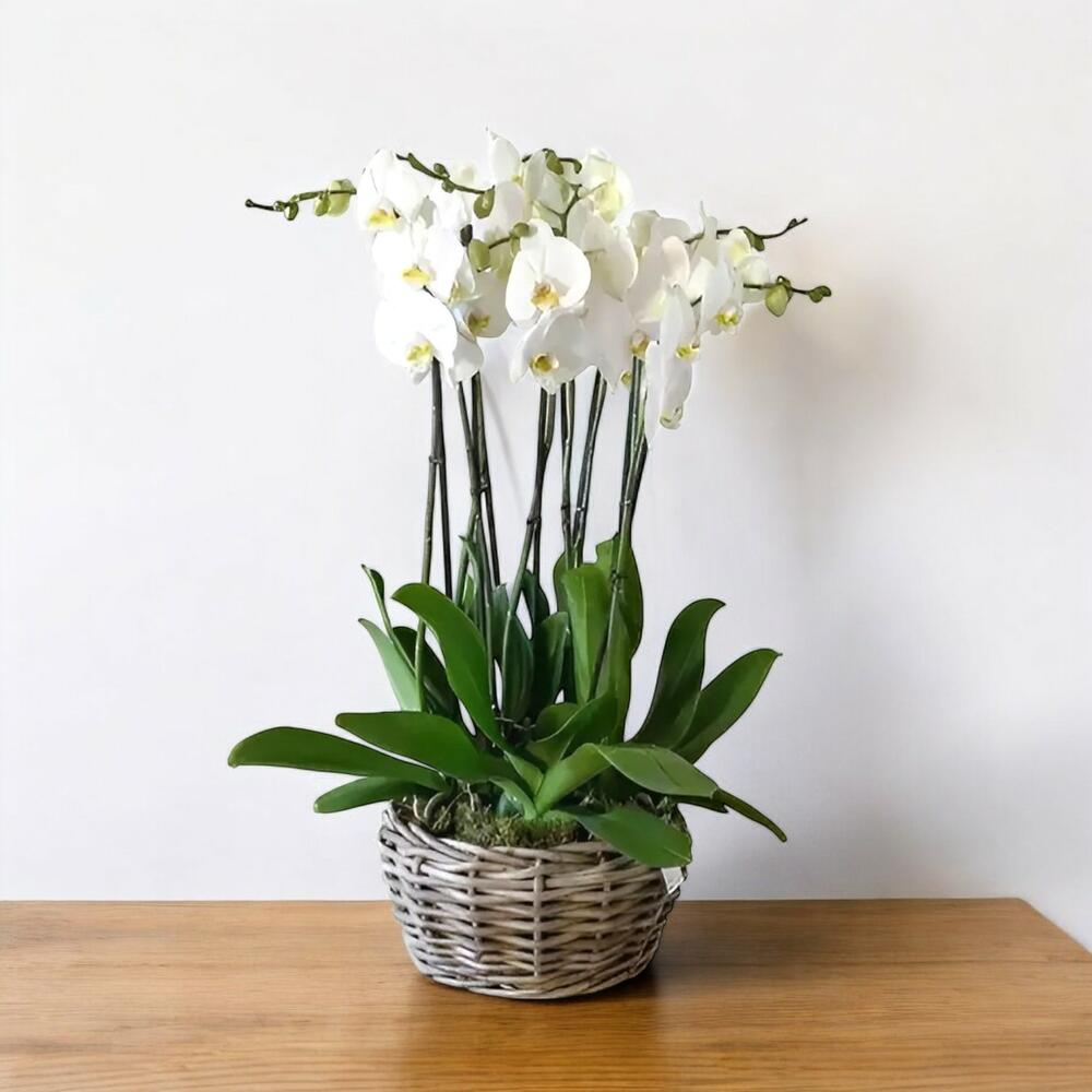 Bu zarif orkide aranjmanı, altı adet beyaz orkidenin mükemmel uyumunu ve doğal güzelliğini bir araya getiriyor. Beyaz orkide çiçekleri, zarif yapıları ve ince detaylarıyla her ortamda sofistike bir hava yaratır. Sade ve zarif tasarımı, sevdiklerinize özel bir hediye seçeneği sunmak için mükemmeldir. Hem evde hem de ofiste uzun süre kalıcı ve şık bir izlenim bırakacak olan bu orkide aranjmanı, yaşam alanlarınıza estetik bir dokunuş katacaktır.