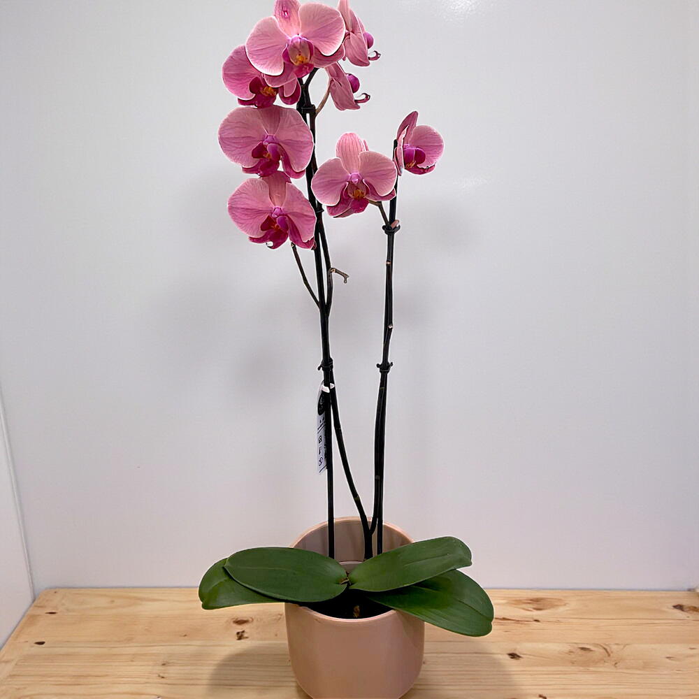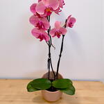 Bej renkli seramik saksıda çift dallı ateş kırmızı orkide