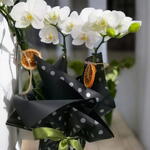 Bu şık orkide buketi, zarafeti ve sadeliğiyle her ortamı aydınlatacak. Beyaz orkide çiçeklerinin zarifliği, siyah ve beyaz noktalı ambalajla mükemmel bir uyum içinde. Ayrıca, kuru portakal dilimleriyle yapılan doğal süslemeler, bukete sıcak ve doğal bir dokunuş katıyor. Buketin altındaki yeşil kurdele ise şıklığını tamamlıyor. Modern ve şık tasarımı ile bu orkide buketi, sevdiklerinize unutulmaz bir hediye sunmak için mükemmel bir seçim. Hem zarif hem de etkileyici olan bu orkide, her anınıza güzellik katacak!