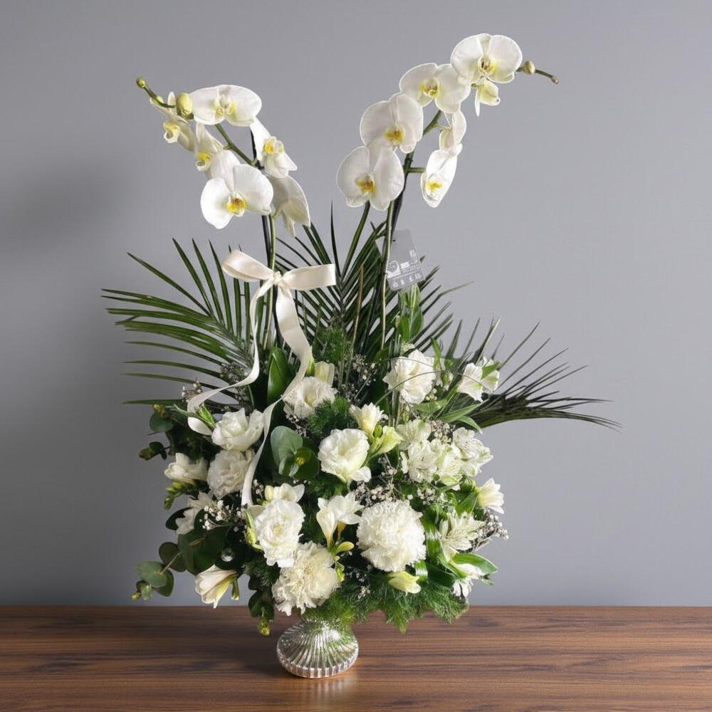Bu muhteşem beyaz orkide aranjmanı, zarafetin ve saflığın simgesi olarak özel anlarınıza anlam katıyor. İki dal saf beyaz orkidenin asil görünümü, beyaz güllerin ve karanfillerin zamansız güzelliğiyle birleşerek ferahlatıcı bir atmosfer sunuyor. Frezyaların hafif kokusu ve cipso çiçeklerinin zarif dokunuşu, aranjmana romantik bir hava katıyor. Kristal görünümlü şık vazosu ile mekânlarınıza modern ve sofistike bir dokunuş ekliyor.