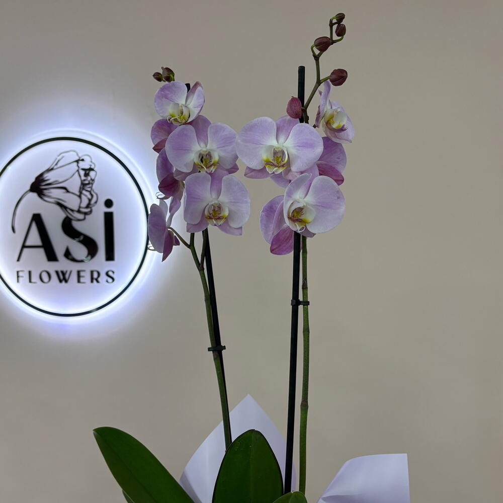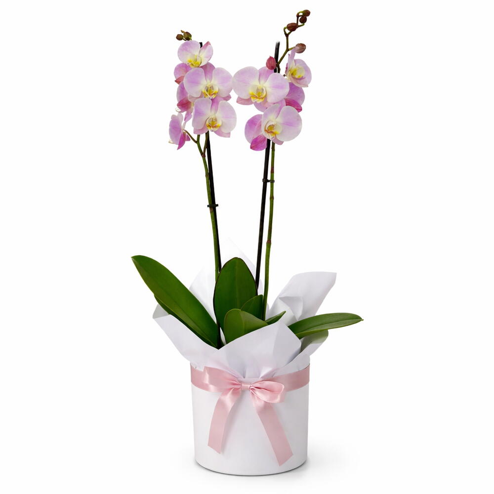 Zarif ve uzun ömürlü Phalaenopsis orkide, şık saksı sunumu ile hem ev hem ofis için sofistike bir hediye seçeneğidir. Minimal ve modern görünümü sayesinde her dekorasyona uyum sağlar. Çift dallı formu ve bol çiçekli yapısı ile bulunduğu ortama ferahlık ve zarafet katar.